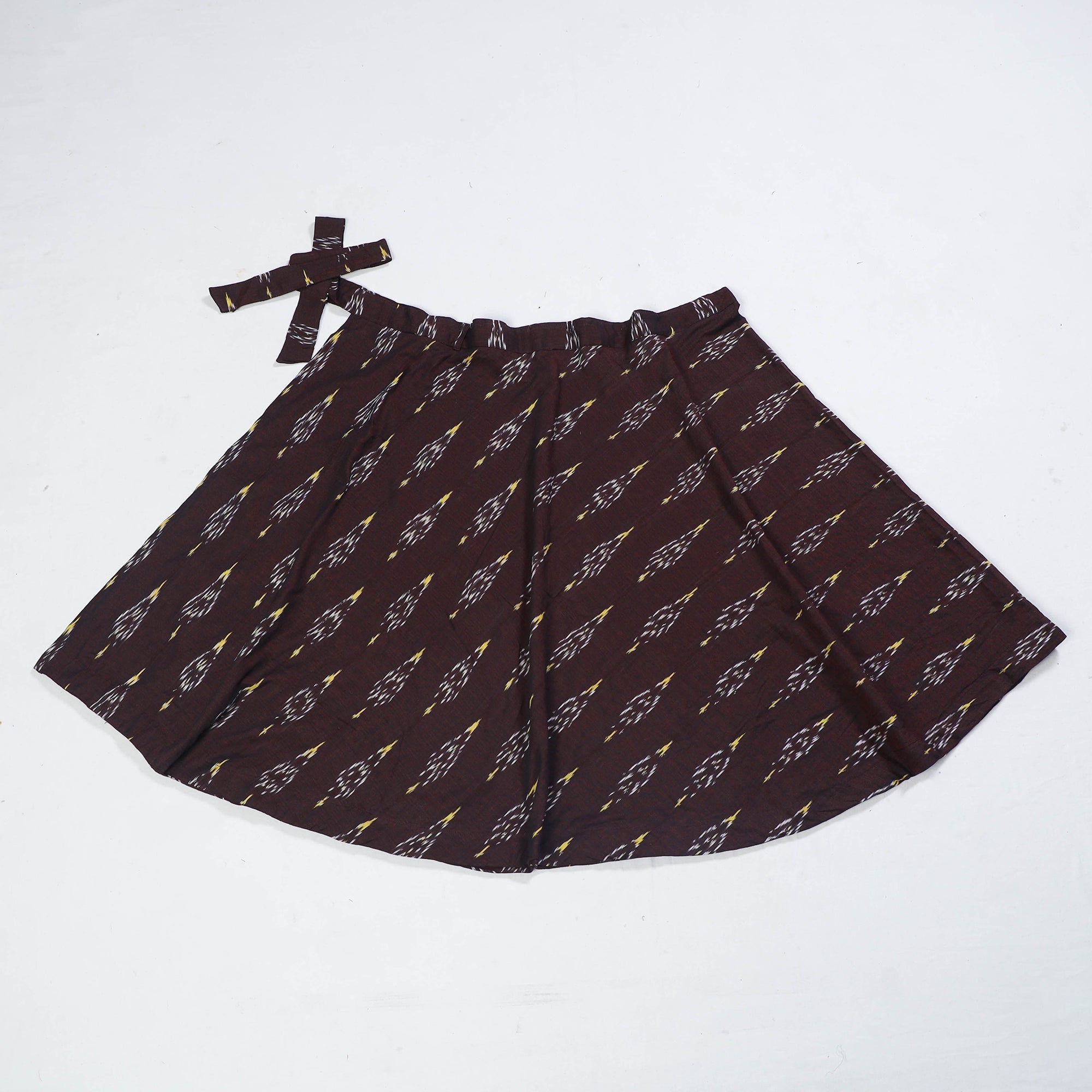 Wrap yourself in the tradition with our brown wrap around cotton pochampally ikat skirt . Showcasing the intricate patterns of the ikat weaving technique, this wrap-around skirt is a testament to Indias rich textile heritage. Crafted from eco-friendly cotton, it breathable comfort and a customizable fit with its waist tie-up closure. Ideal for casual days or festive evenings, it effortlessly blends cultural artistry with modern fashion.