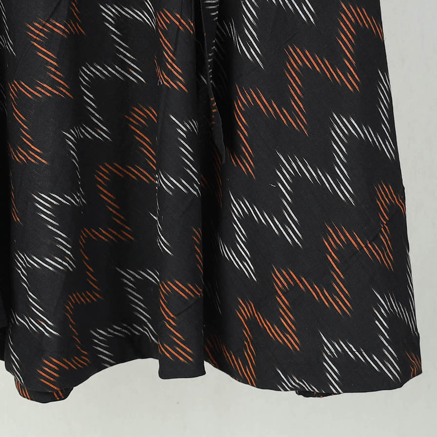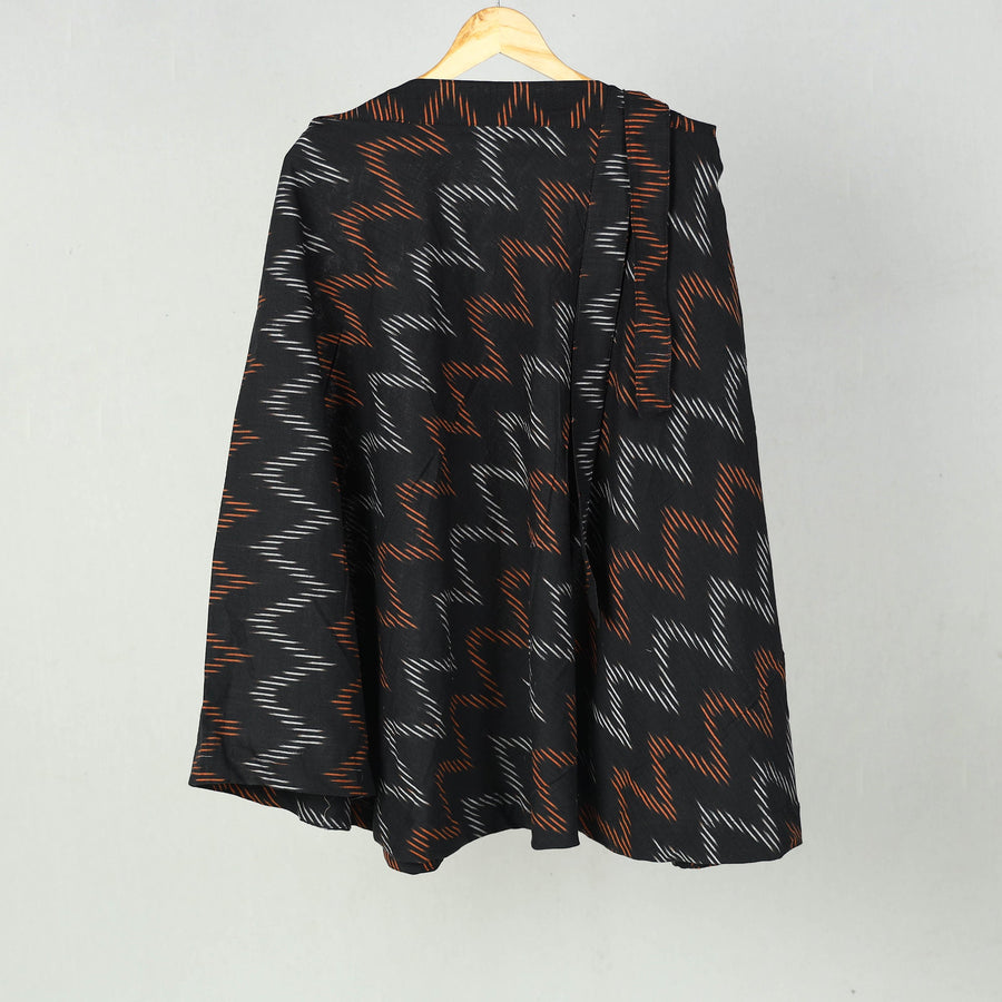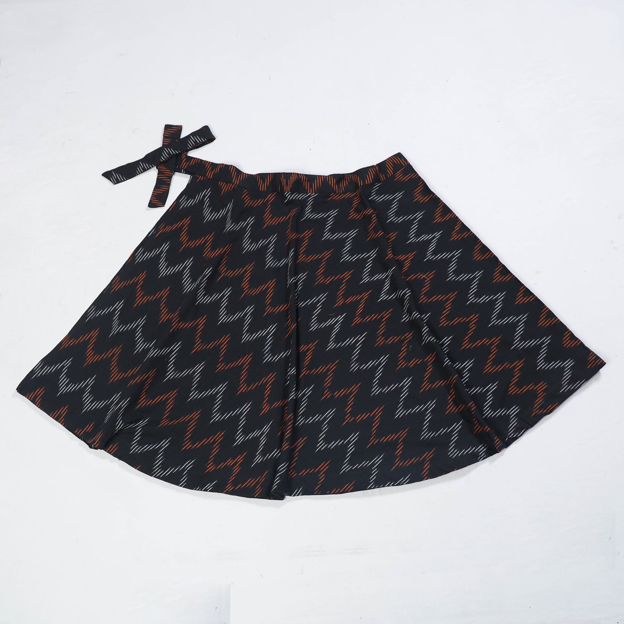 Wrap yourself in the tradition with our black wrap around cotton pochampally ikat skirt . Showcasing the intricate patterns of the ikat weaving technique, this wrap-around skirt is a testament to Indias rich textile heritage. Crafted from eco-friendly cotton, it breathable comfort and a customizable fit with its waist tie-up closure. Ideal for casual days or festive evenings, it effortlessly blends cultural artistry with modern fashion.