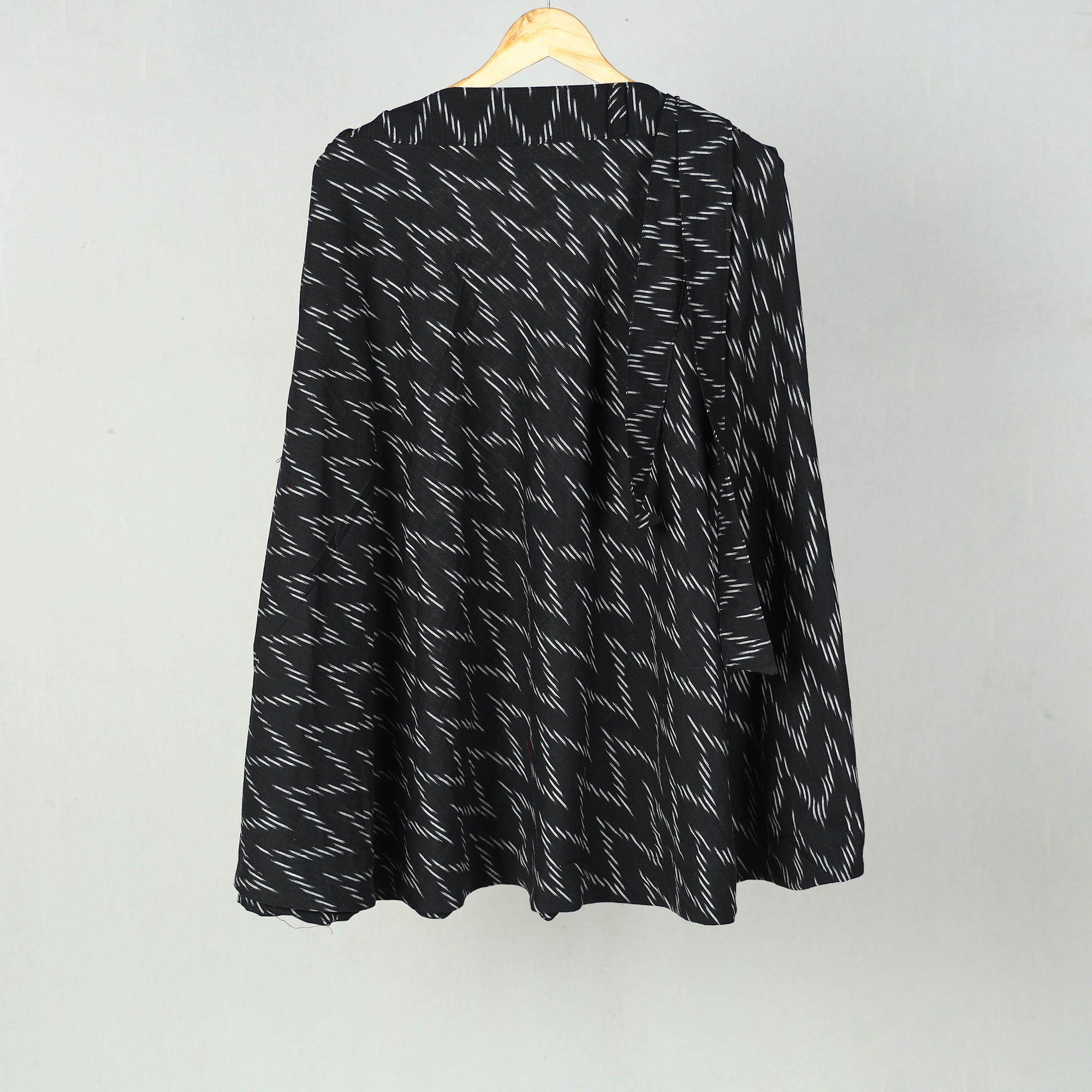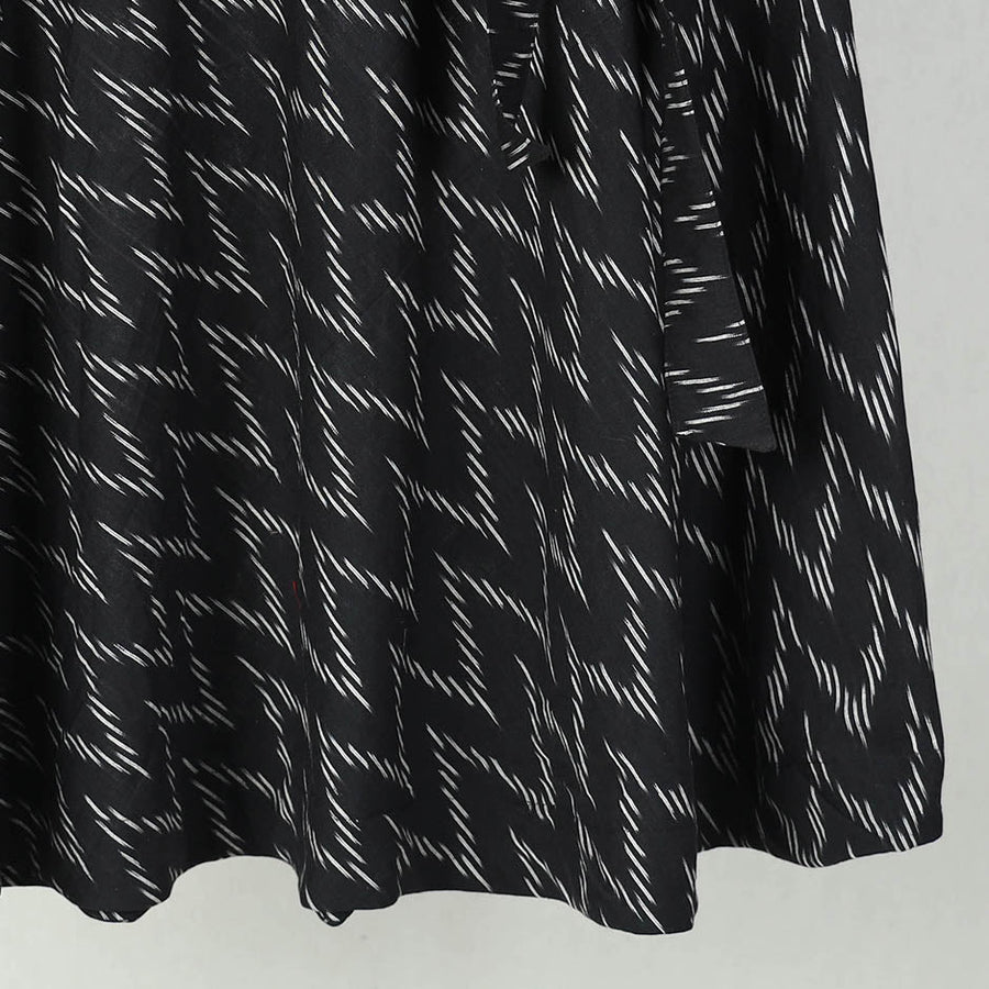 Wrap yourself in the tradition with our black wrap around cotton pochampally ikat skirt . Showcasing the intricate patterns of the ikat weaving technique, this wrap-around skirt is a testament to Indias rich textile heritage. Crafted from eco-friendly cotton, it breathable comfort and a customizable fit with its waist tie-up closure. Ideal for casual days or festive evenings, it effortlessly blends cultural artistry with modern fashion.