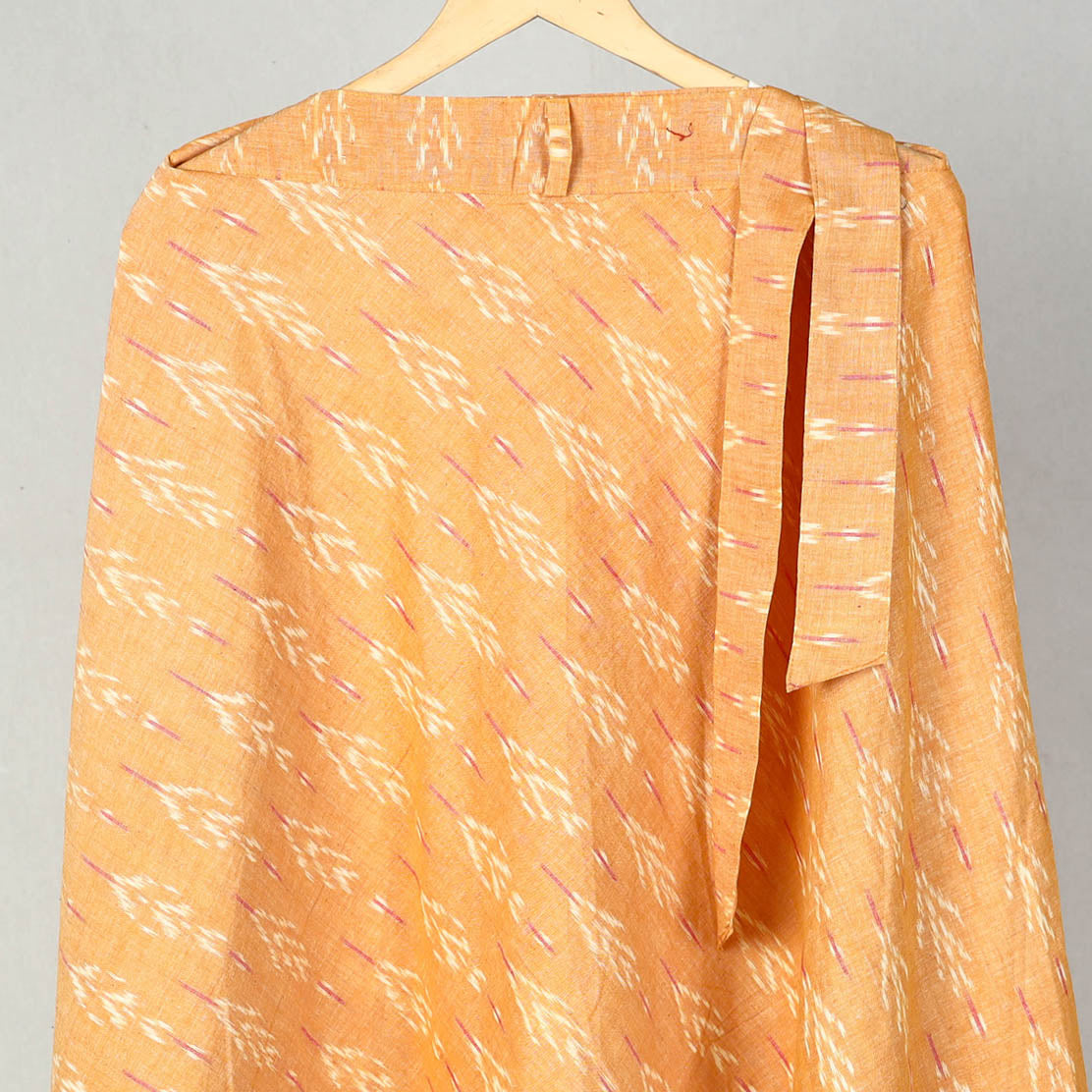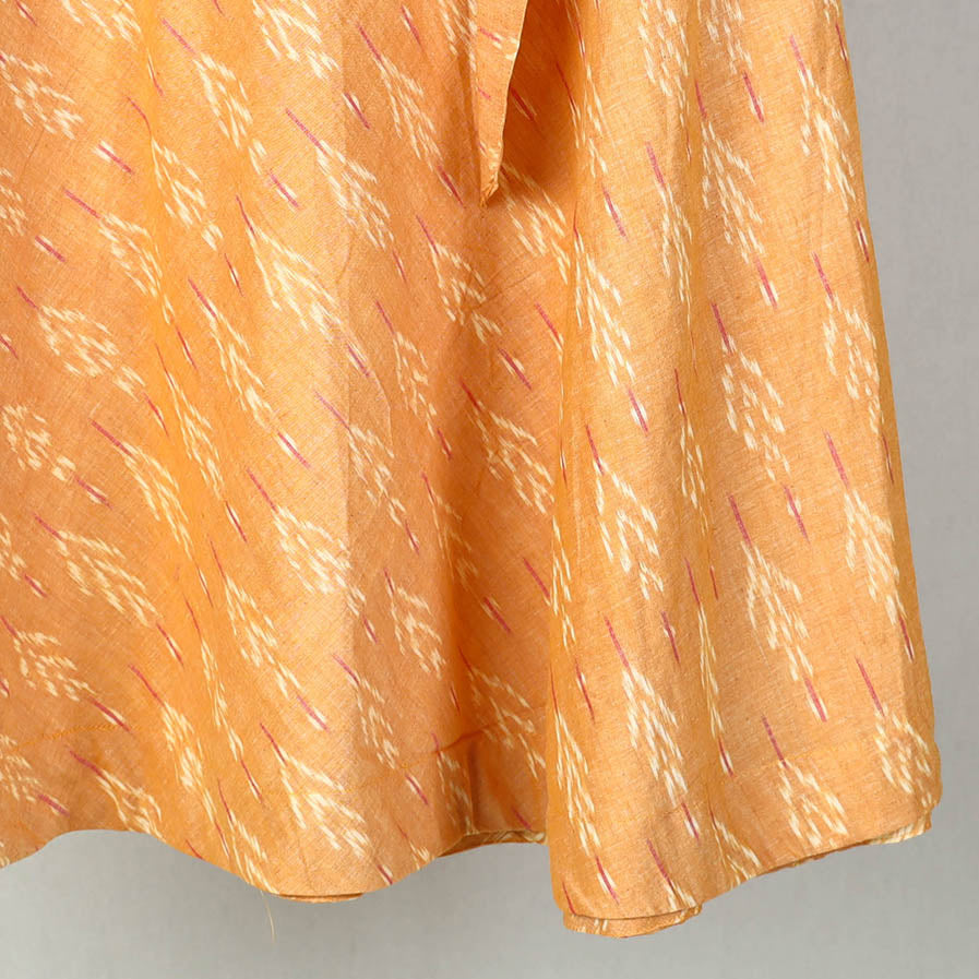 Wrap yourself in the tradition with our light orange wrap around cotton light orange pochampally ikat skirt . Showcasing the intricate patterns of the ikat weaving technique, this wrap-around skirt is a testament to Indias rich textile heritage. Crafted from eco-friendly cotton, it breathable comfort and a customizable fit with its waist tie-up closure. Ideal for casual days or festive evenings, it effortlessly blends cultural artistry with modern fashion.