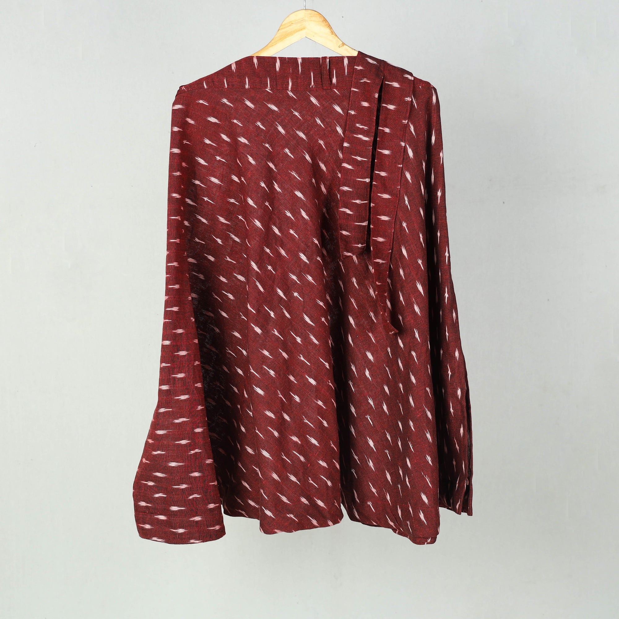 Wrap yourself in the tradition with our maroon wrap around cotton pochampally ikat skirt . Showcasing the intricate patterns of the ikat weaving technique, this wrap-around skirt is a testament to Indias rich textile heritage. Crafted from eco-friendly cotton, it breathable comfort and a customizable fit with its waist tie-up closure. Ideal for casual days or festive evenings, it effortlessly blends cultural artistry with modern fashion.