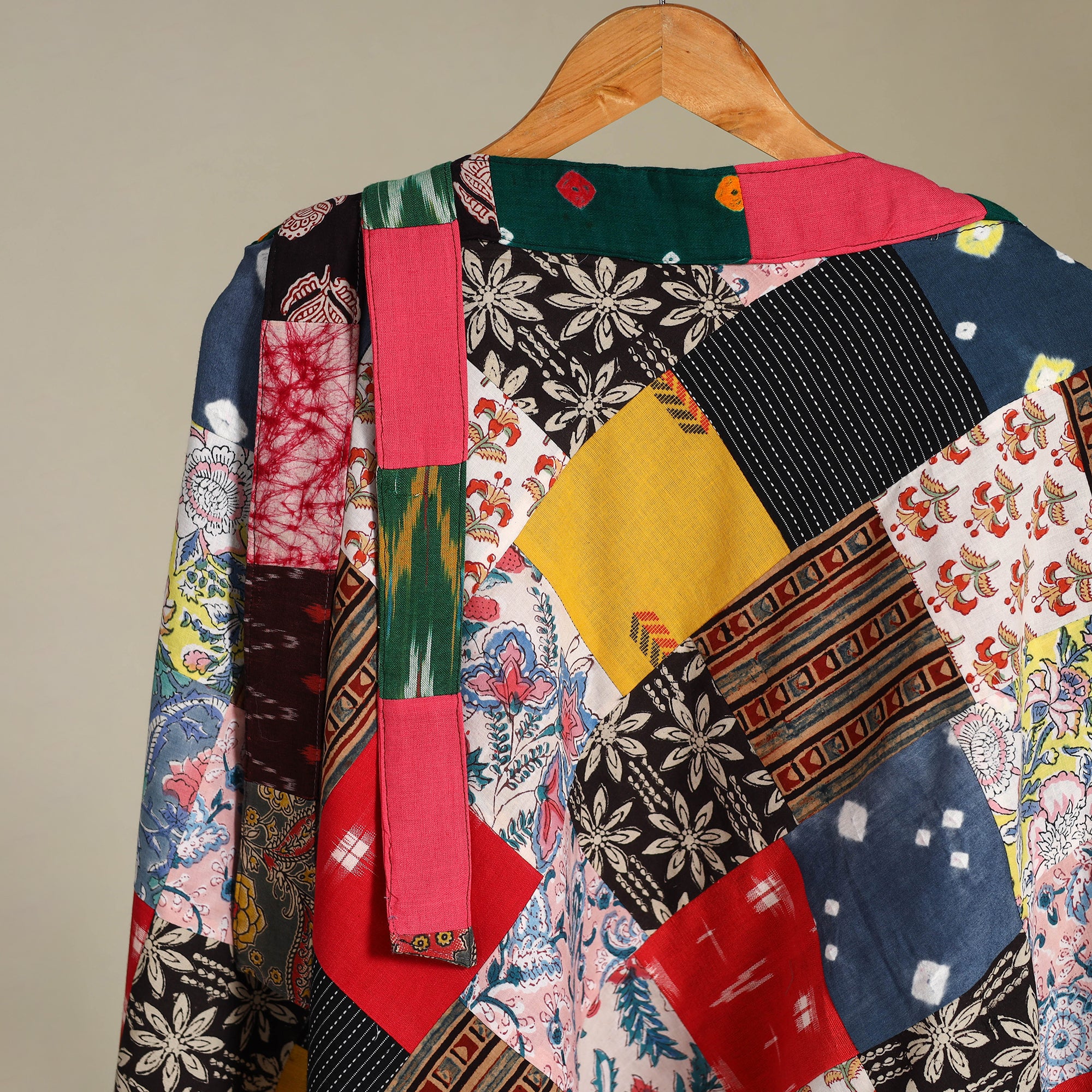 Step into effortless style with this multicolor cotton wrap-around skirt, crafted using regional tukdi-style patchwork techniques. Each panel is made by combining textile remnants sourced from a mix of Indian crafts. Lightweight and breathable, it features a comfortable wrap fit that adjusts to your waist, making it perfect for casual days, laid-back vibes, or beachy getaways.