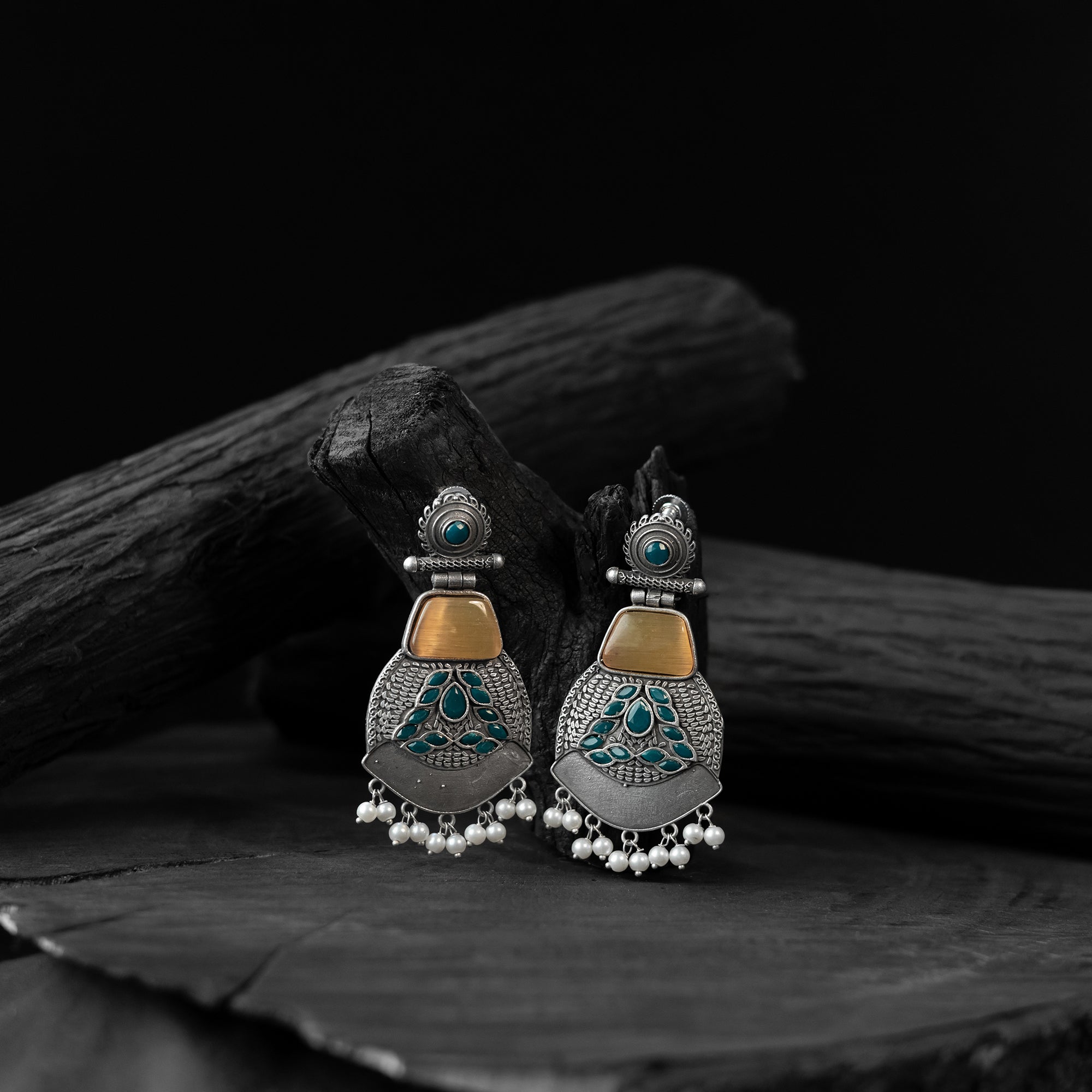 Yellow oxidised handcrafted earrings made with a blend of metal, stones, pearls, beads, and fine detailing. Perfect for festive occasions, weddings, casual outings, office wear, or vacations. Their elegant black and silver tones pair beautifully with everything from casual jeans and flowy dresses to chic office ensembles. A meaningful gift for mother, sister, wife, or girlfriend adding a beautiful touch of tradition to every moment.