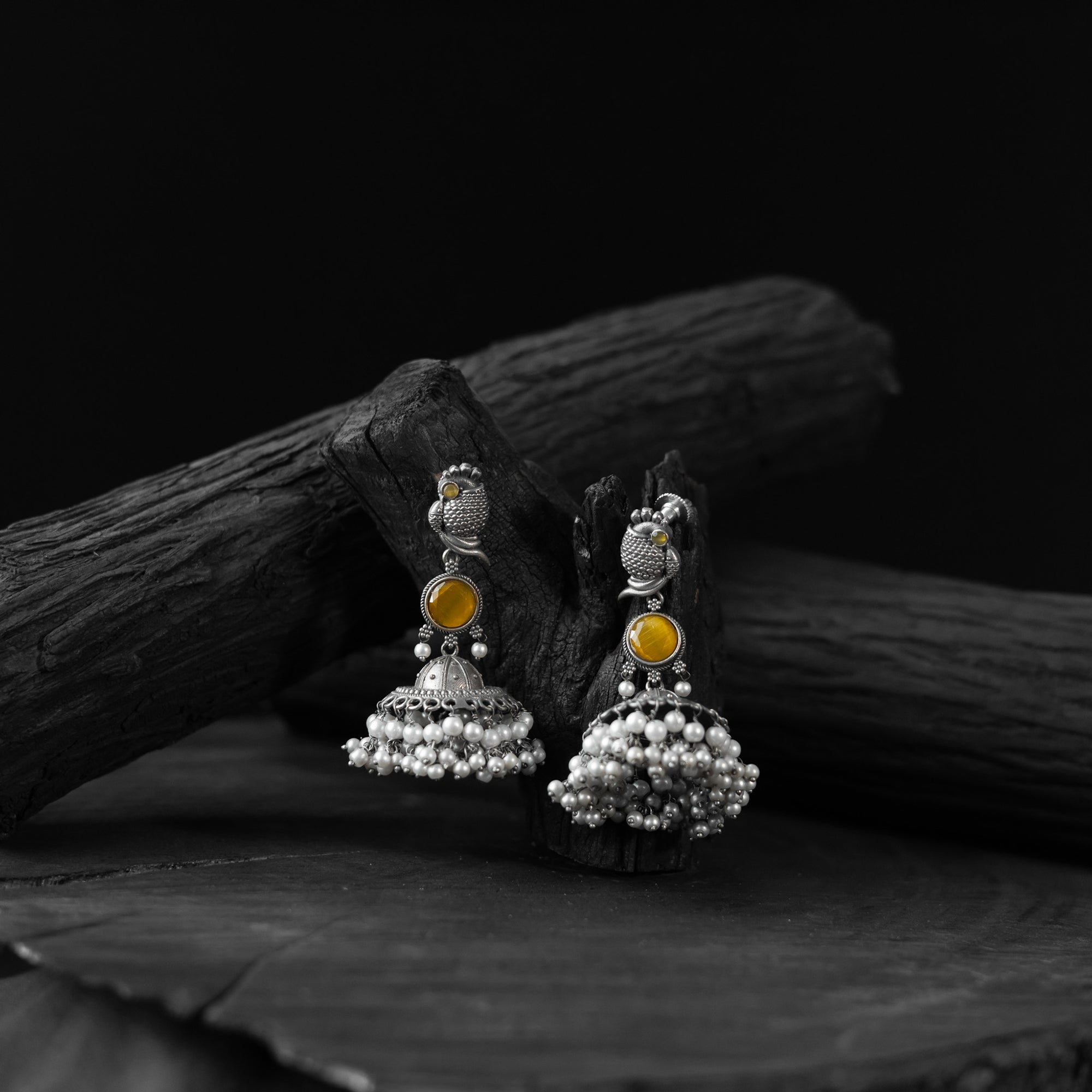 Oxidised handcrafted yellow earrings made with a blend of metal, stones, pearls, beads, and fine detailing. Perfect for festive occasions, weddings, casual outings, office wear, or vacations. Their elegant black and silver tones pair beautifully with everything from casual jeans and flowy dresses to chic office ensembles. A meaningful gift for mother, sister, wife, or girlfriend adding a beautiful touch of tradition to every moment.