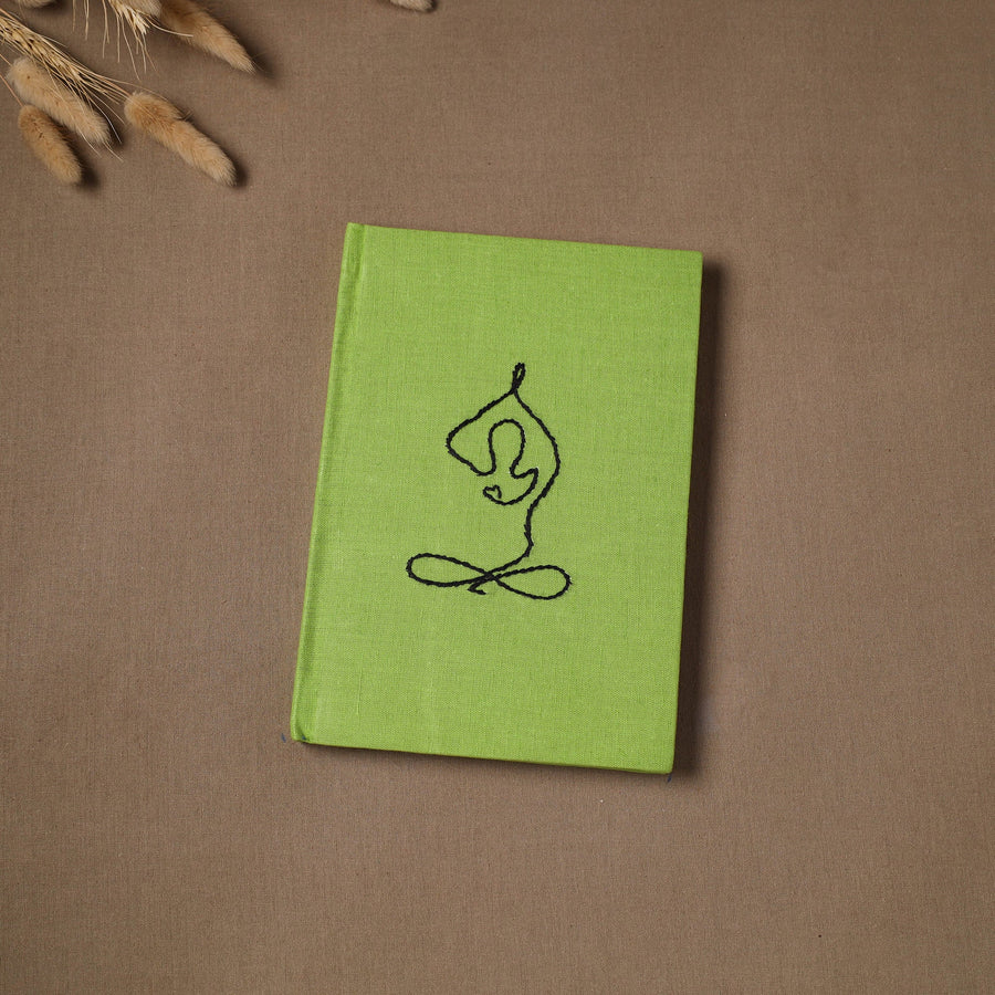 Hand embroidered plain fabric embellished hardbound cover journal / diary with handmade papers. The paper is made from cotton and other natural fibre waste, recycled in an eco-friendly process without the use of chemicals. Crafted by women artisans, this journal features a beautiful embroidery of a yoga figure, who give careful personal attention to every detail. A creative and practical choice for journaling, planning or capturing daily thoughts, and also a thoughtful gift for a yoga teacher.