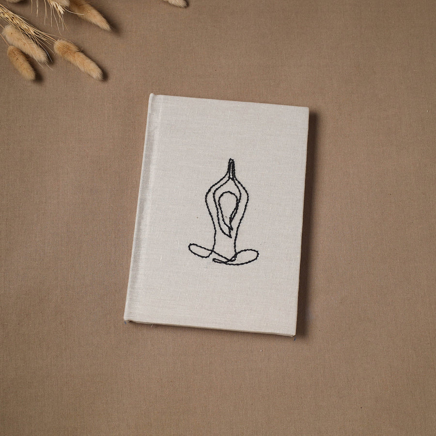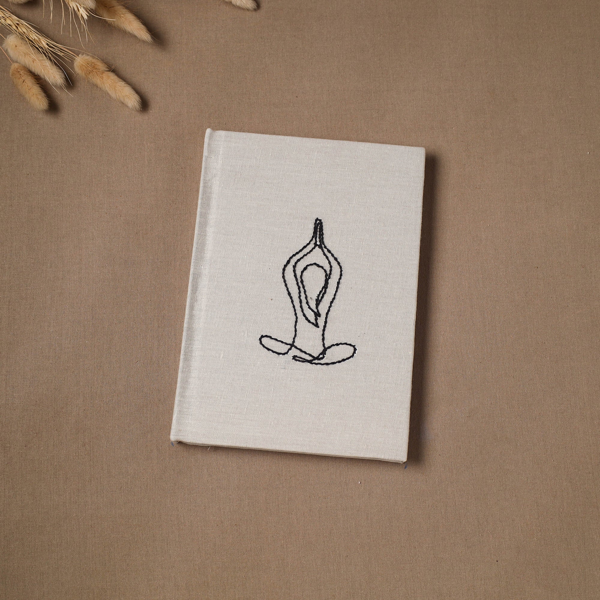 Hand embroidered plain fabric embellished hardbound cover journal / diary with handmade papers. The paper is made from cotton and other natural fibre waste, recycled in an eco-friendly process without the use of chemicals. Crafted by women artisans, this journal features a beautiful embroidery of a yoga figure, who give careful personal attention to every detail. A creative and practical choice for journaling, planning or capturing daily thoughts, and also a thoughtful gift for a yoga teacher.