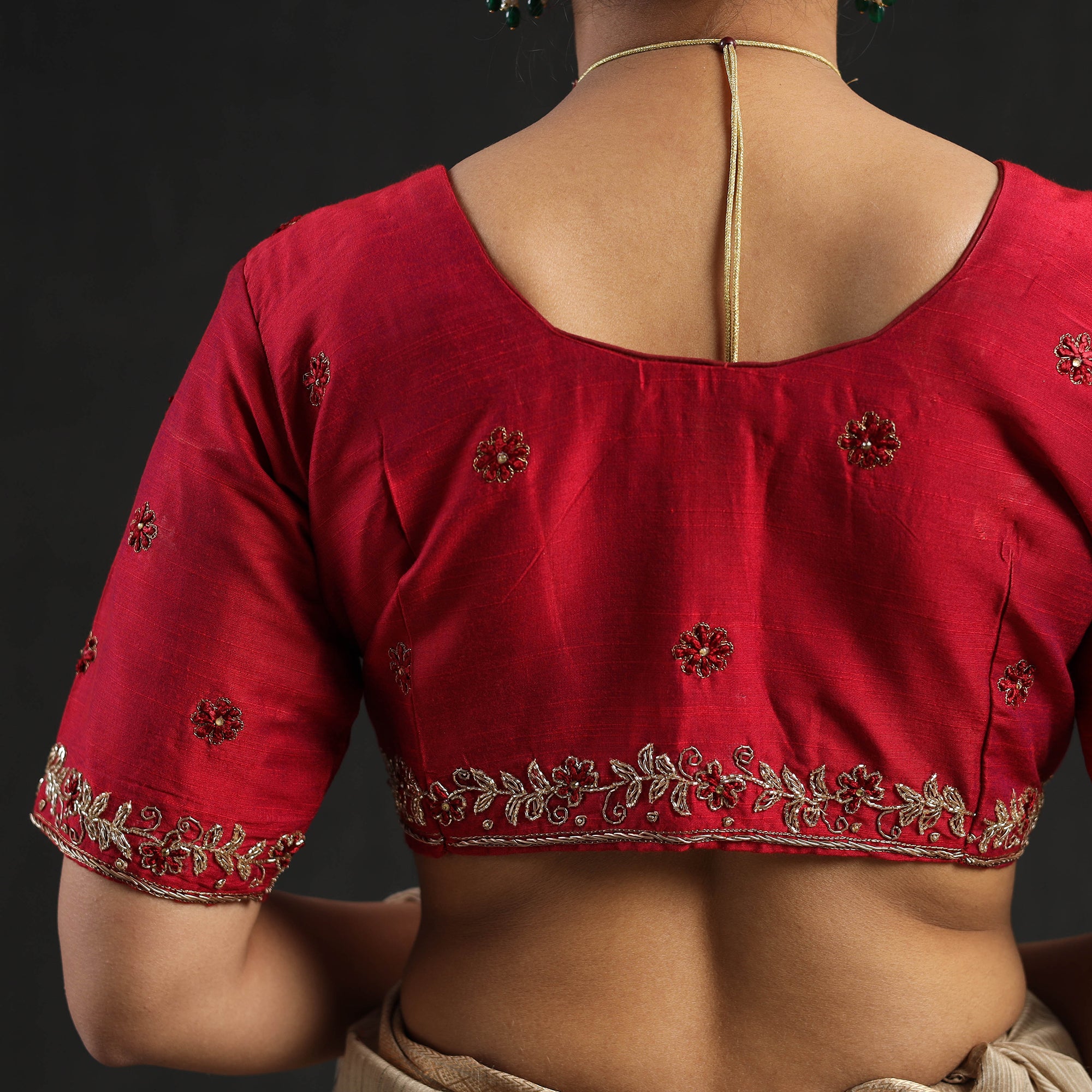 This red zardozi hand-embroidered slub silk plain blouse is meticulously hand-embroidered with elegant zardozi work. Blending modern comfort with traditional artistry, it offers a relaxed fit with half sleeves and a secure hook lock. This blouse seamlessly blends traditional craftsmanship, making it perfect for festive occasions or casual gatherings.