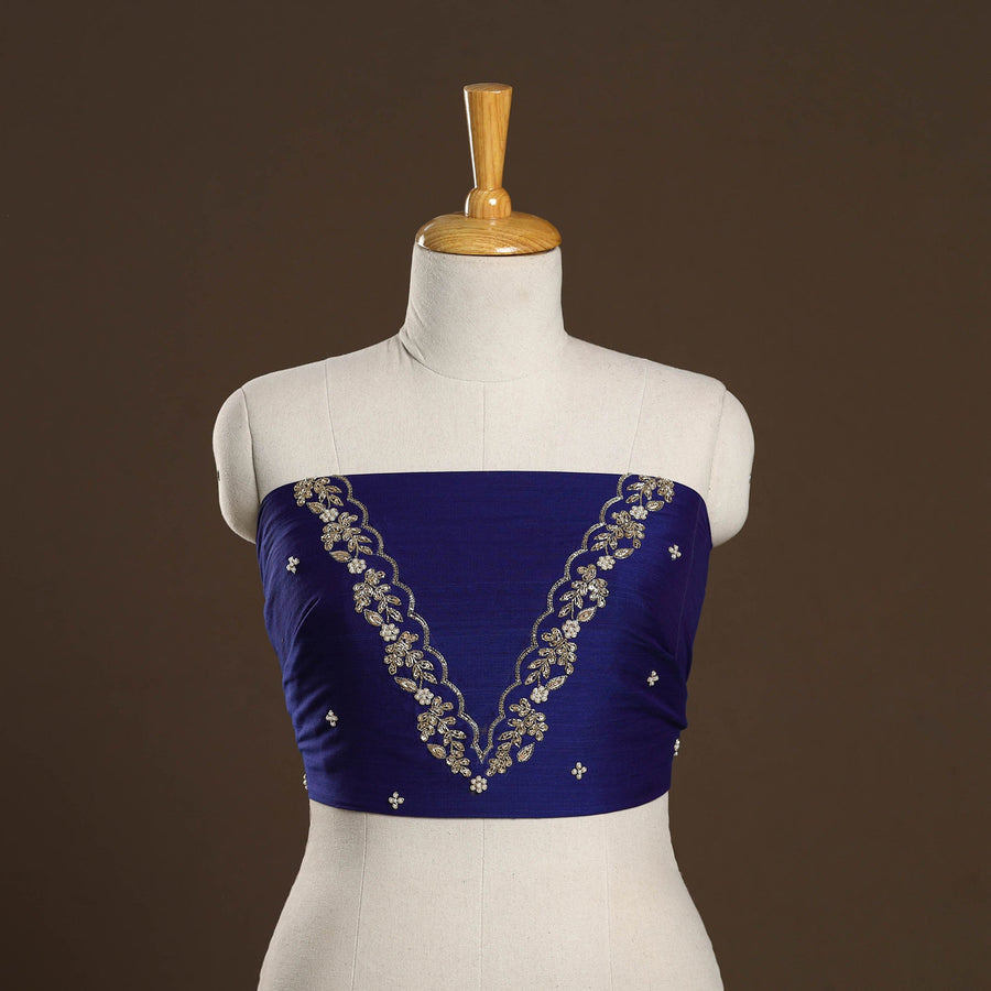 Blue - Zardozi Hand Embroidery Slub Silk Plain Blouse Piece 08