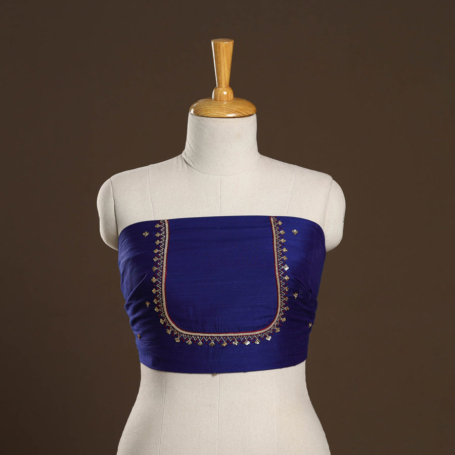 Blue - Zardozi Hand Embroidery Slub Silk Plain Blouse Piece 10