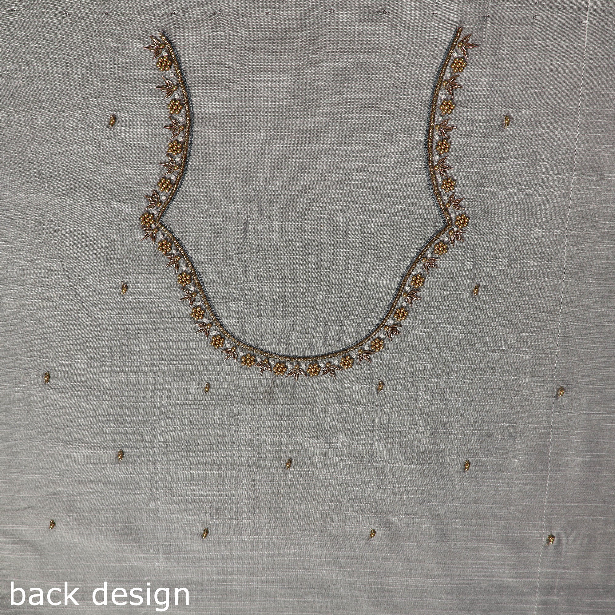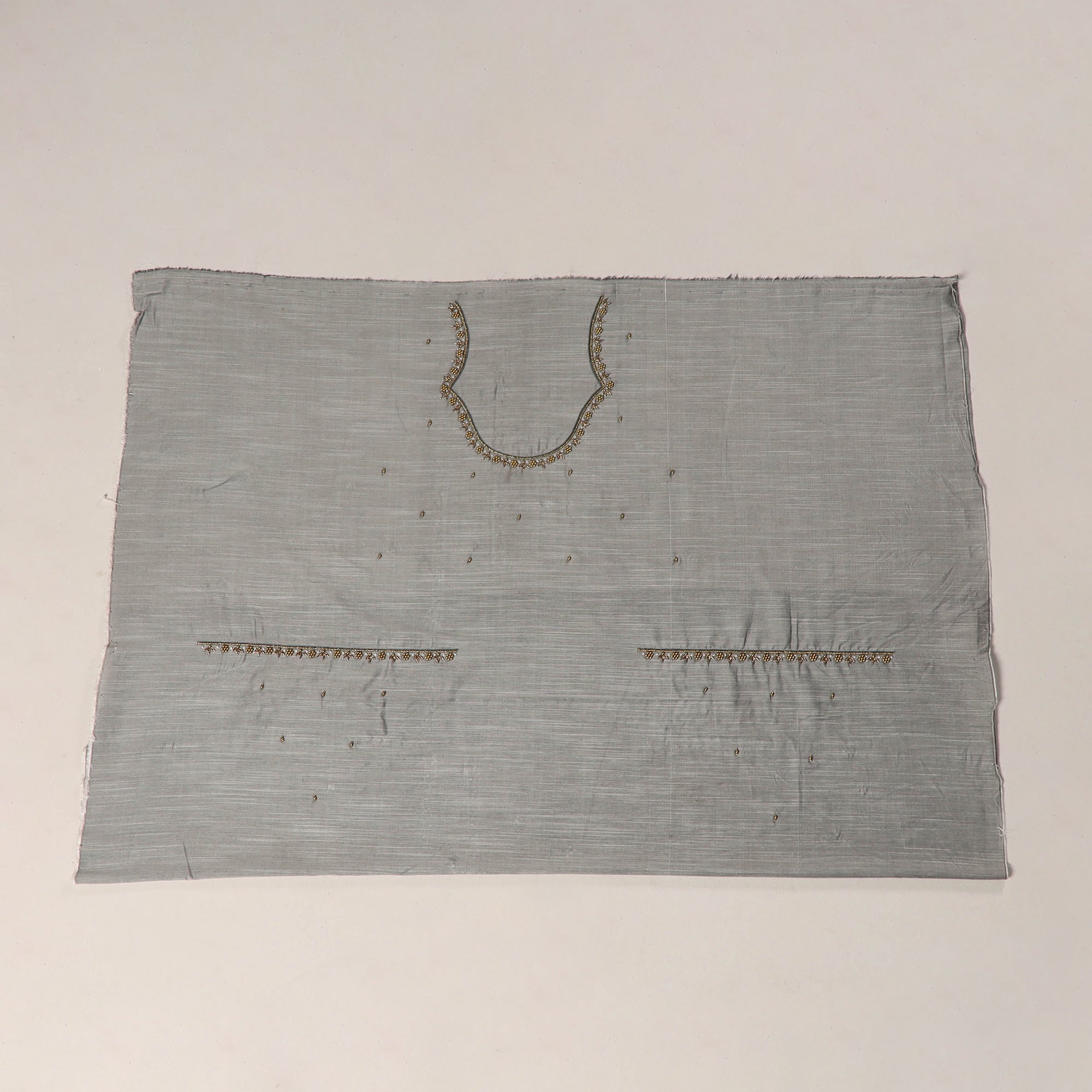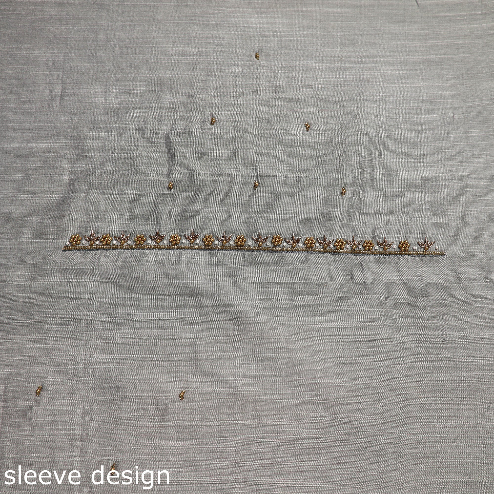 This grey zardozi hand-embroidered slub silk blouse piece features elegant detailing that enhances its festive appeal. The slub silk fabric keeps it stylish yet comfortable. You can tailor it your way, whether simple, trendy, or traditional. A versatile pick for everyday wear as well as special occasions.