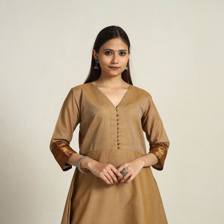 Look and feel beautiful in this uniquely designed a-line camel brown kanchipuram cotton kurta. Crafted from fine-quality cotton fabric. Featuring elegant kanchipuram border designs, it adds a touch of sophistication to your ensemble. Ideal for daily outings and special occasions, this kurta blends tradition with everyday elegance.