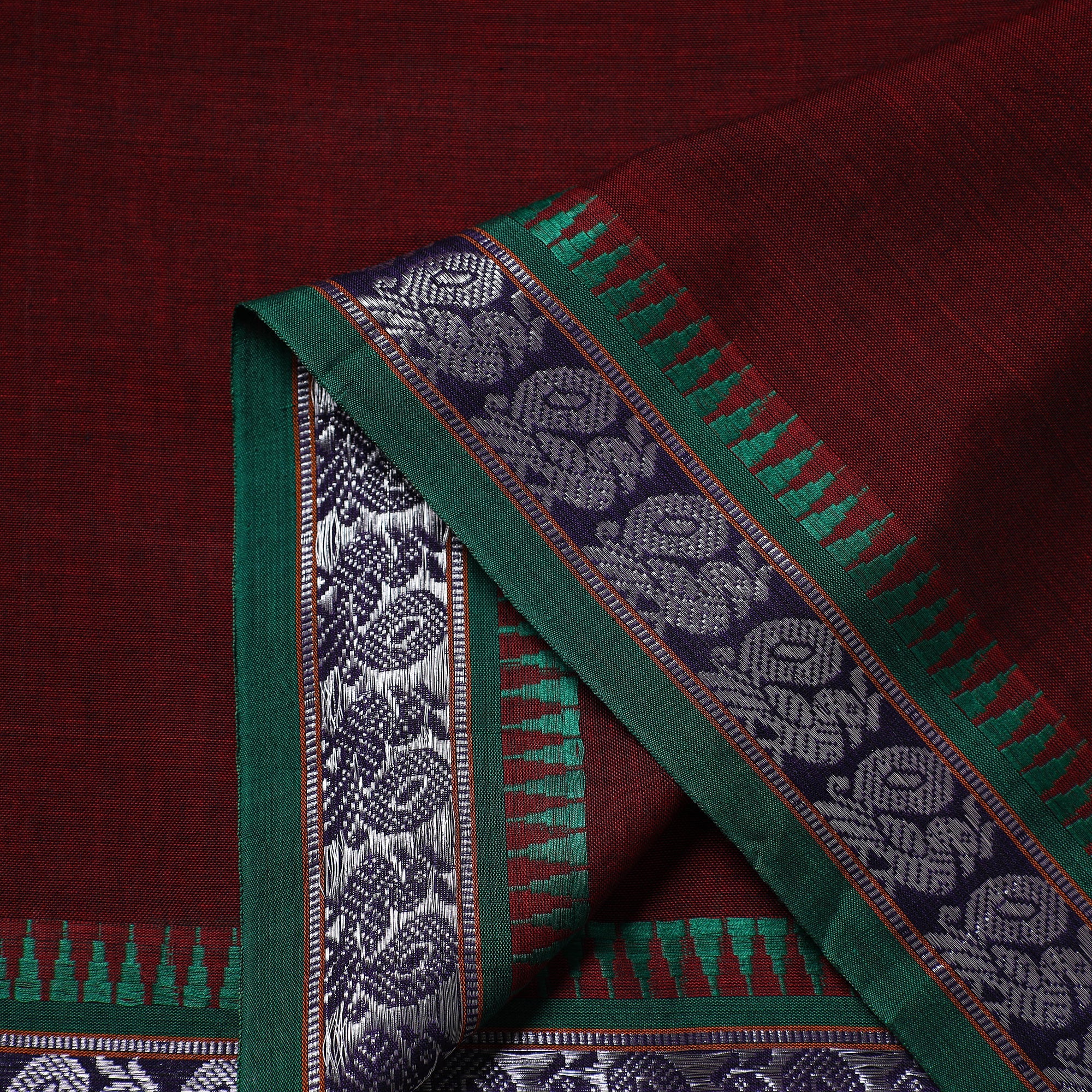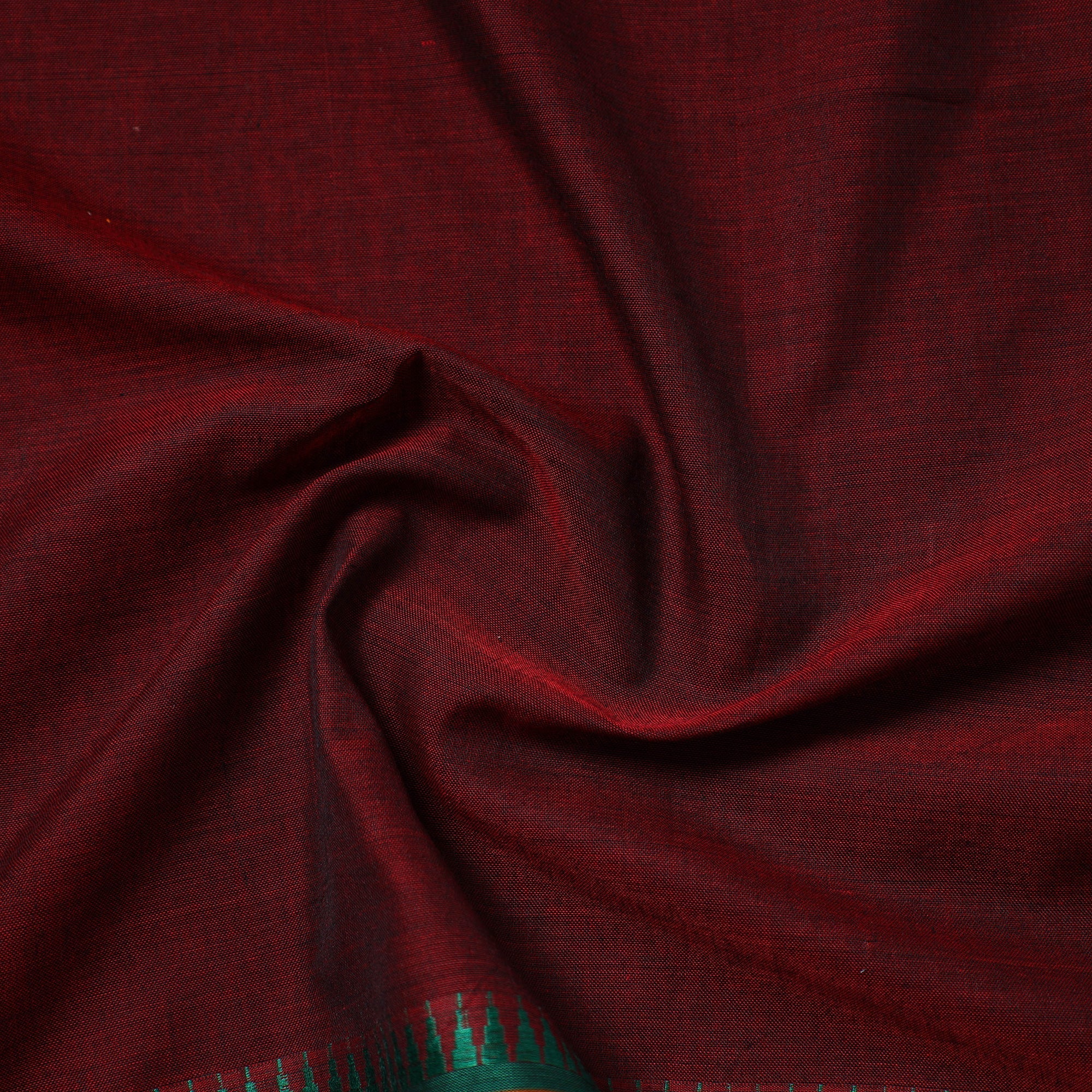 Maroon dharwad cotton fabric with a traditional zari-woven border from Dharwad, Karnataka. This is a machine-made fabric with no handmade process involved. Perfect for a range of attire, home decor, and craft projects, it adds a touch of heritage to your creations.