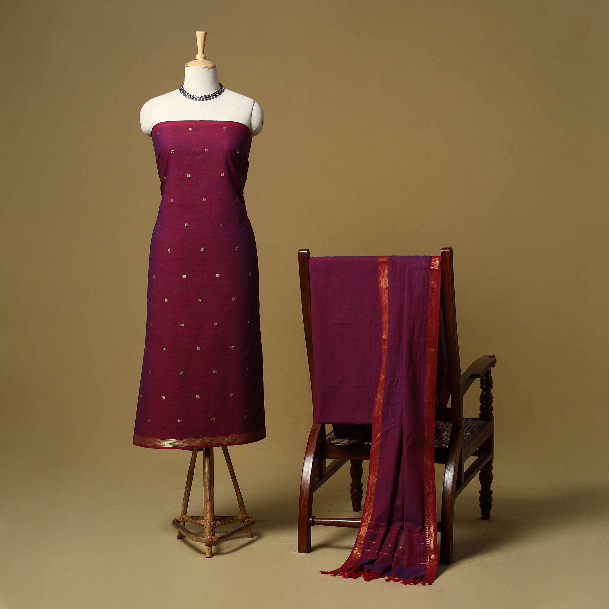 Pure cotton jacquard zari buti 3pc unstitched dress material set from Tamil Nadu, where patterns are created directly during the weaving process. This set includes a beautifully woven kurta fabric, plain bottom fabric and a matching bordered dupatta. Easy to stitch and comfortable to wear, this set works well for daily wear and casual outings.