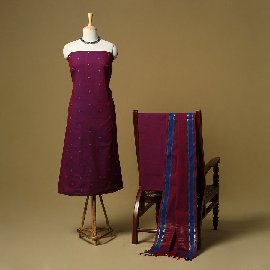 Pure cotton jacquard zari buti 3pc unstitched dress material set from Tamil Nadu, where patterns are created directly during the weaving process. This set includes a beautifully woven kurta fabric, plain bottom fabric and a matching bordered dupatta. Easy to stitch and comfortable to wear, this set works well for daily wear and casual outings.