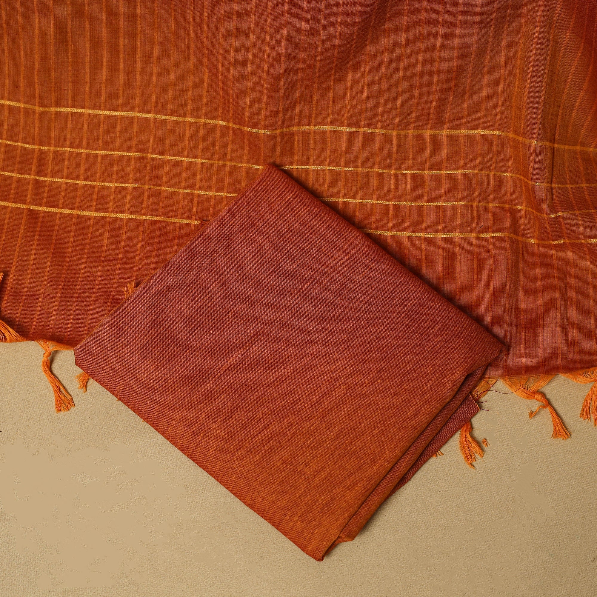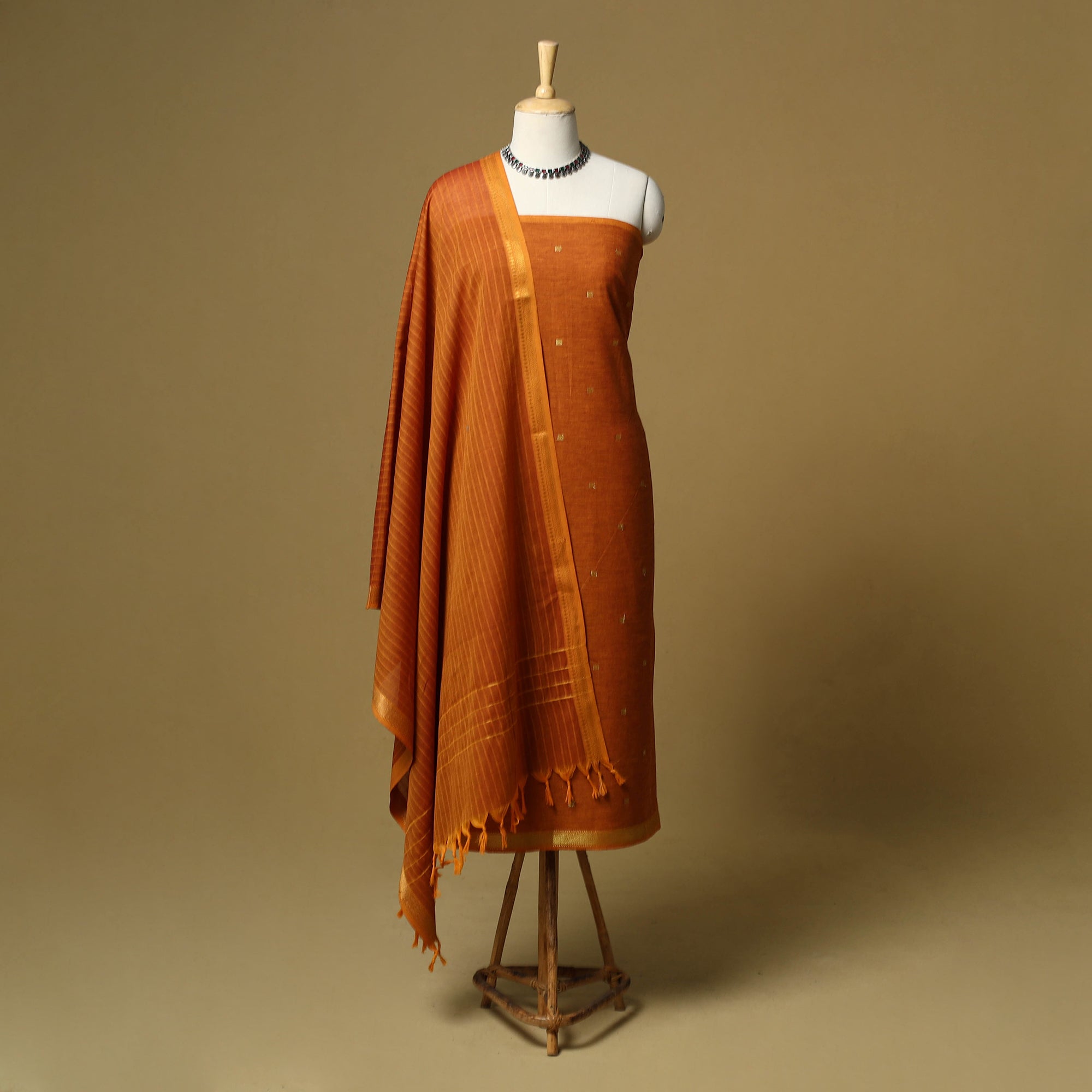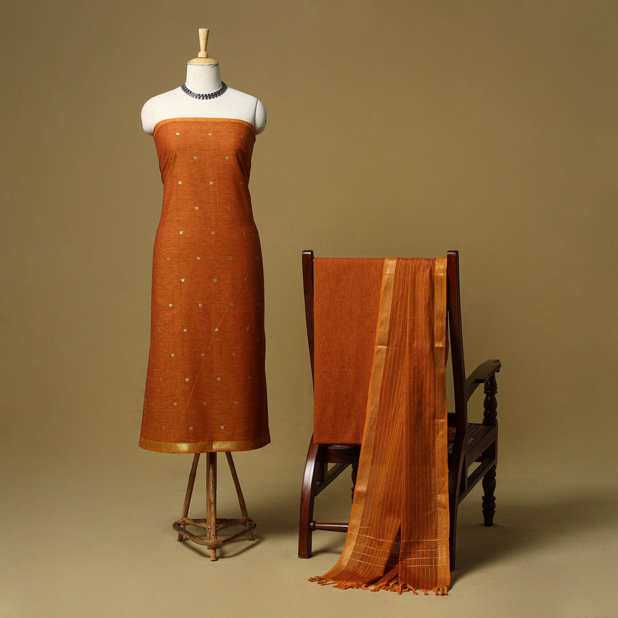 Pure cotton jacquard zari buti 3pc unstitched dress material set from Tamil Nadu, where patterns are created directly during the weaving process. This set includes a beautifully woven kurta fabric, plain bottom fabric and a matching bordered dupatta. Easy to stitch and comfortable to wear, this set works well for daily wear and casual outings.