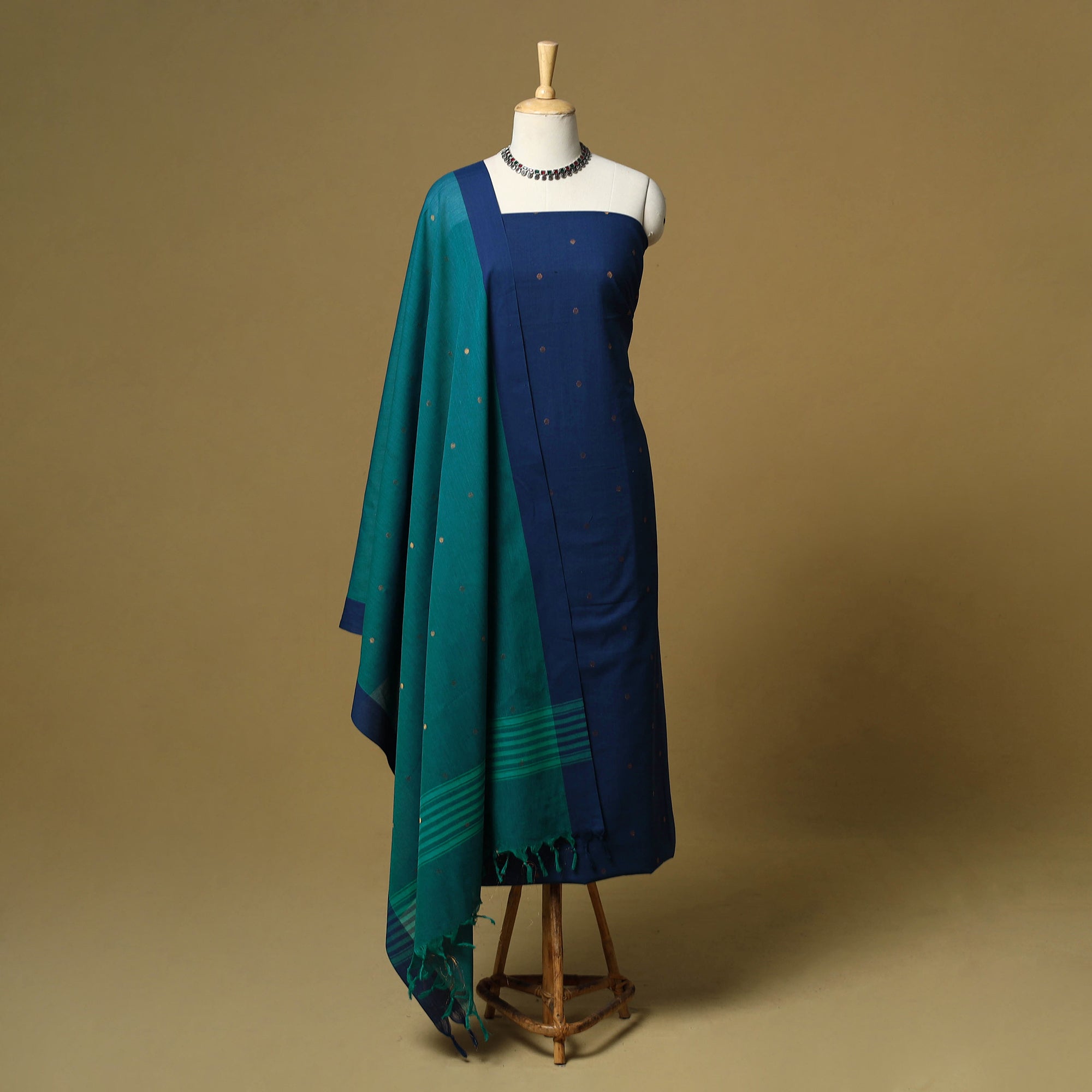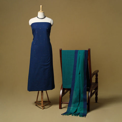 Pure cotton jacquard zari buti 3pc unstitched dress material set from Tamil Nadu, where patterns are created directly during the weaving process. This set includes a beautifully woven kurta fabric, plain bottom fabric and a matching bordered dupatta. Easy to stitch and comfortable to wear, this set works well for daily wear and casual outings.