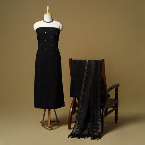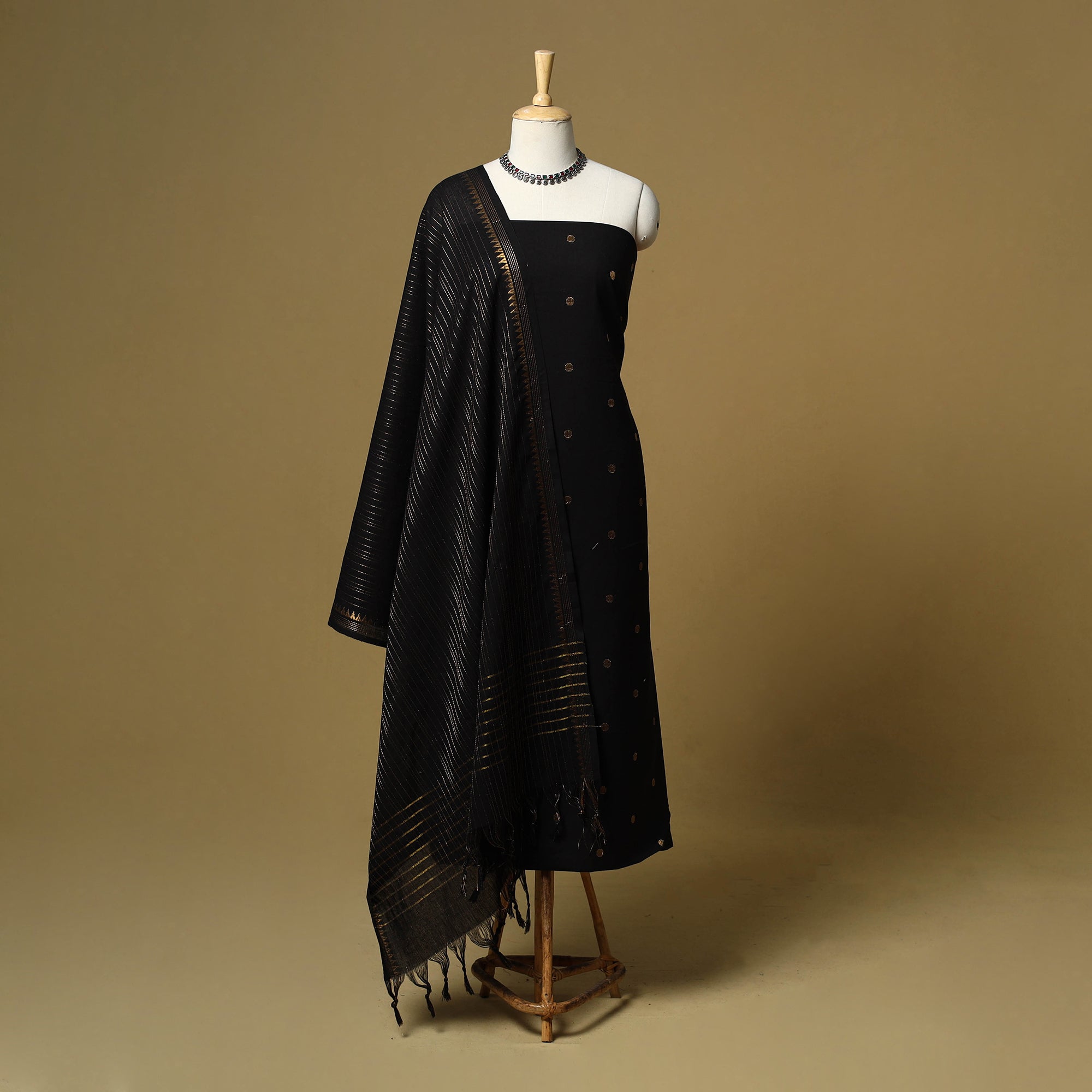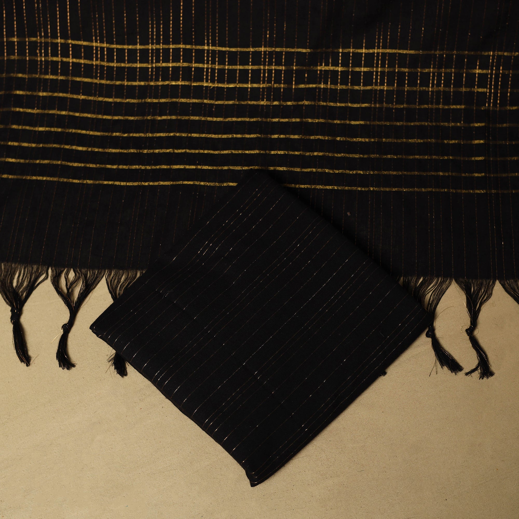 Pure cotton jacquard zari buti 3pc unstitched dress material set from Tamil Nadu, where patterns are created directly during the weaving process. This set includes a beautifully woven kurta fabric, plain bottom fabric and a matching bordered dupatta. Easy to stitch and comfortable to wear, this set works well for daily wear and casual outings.