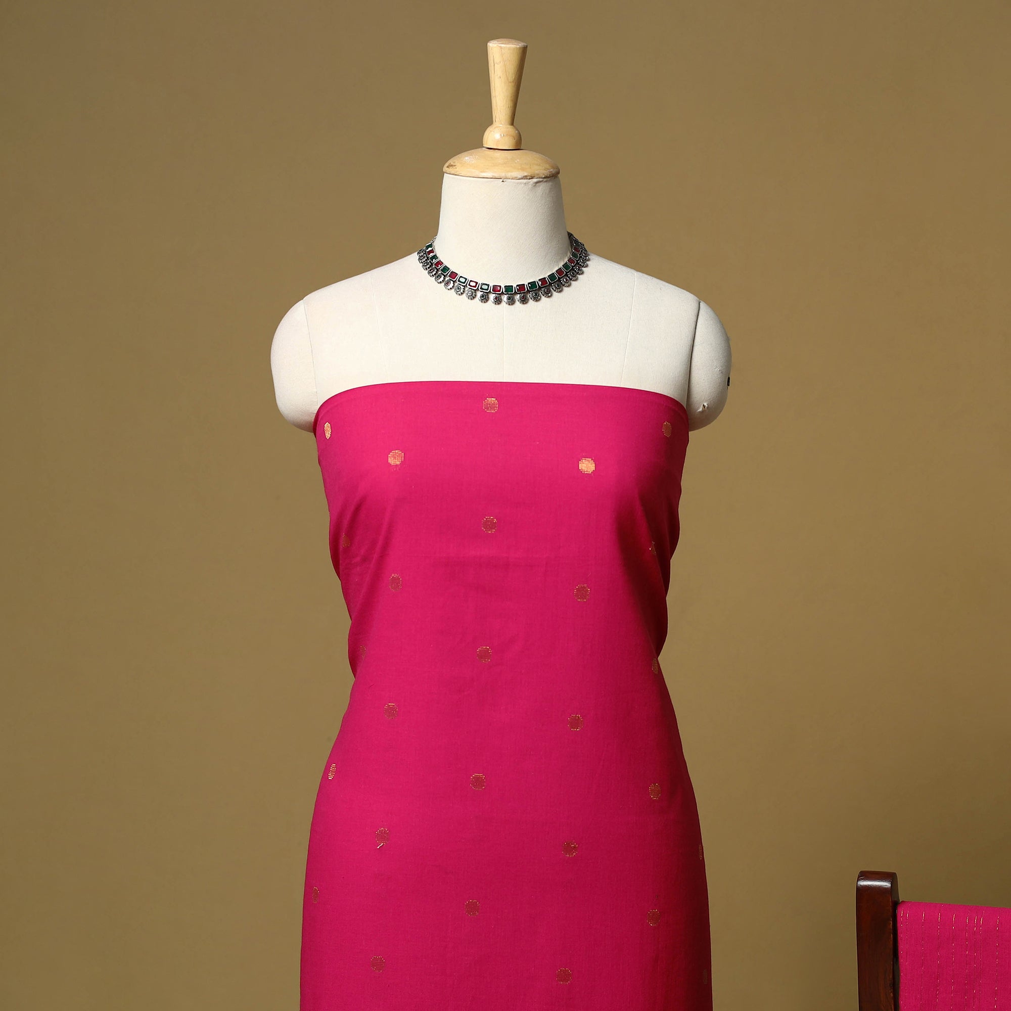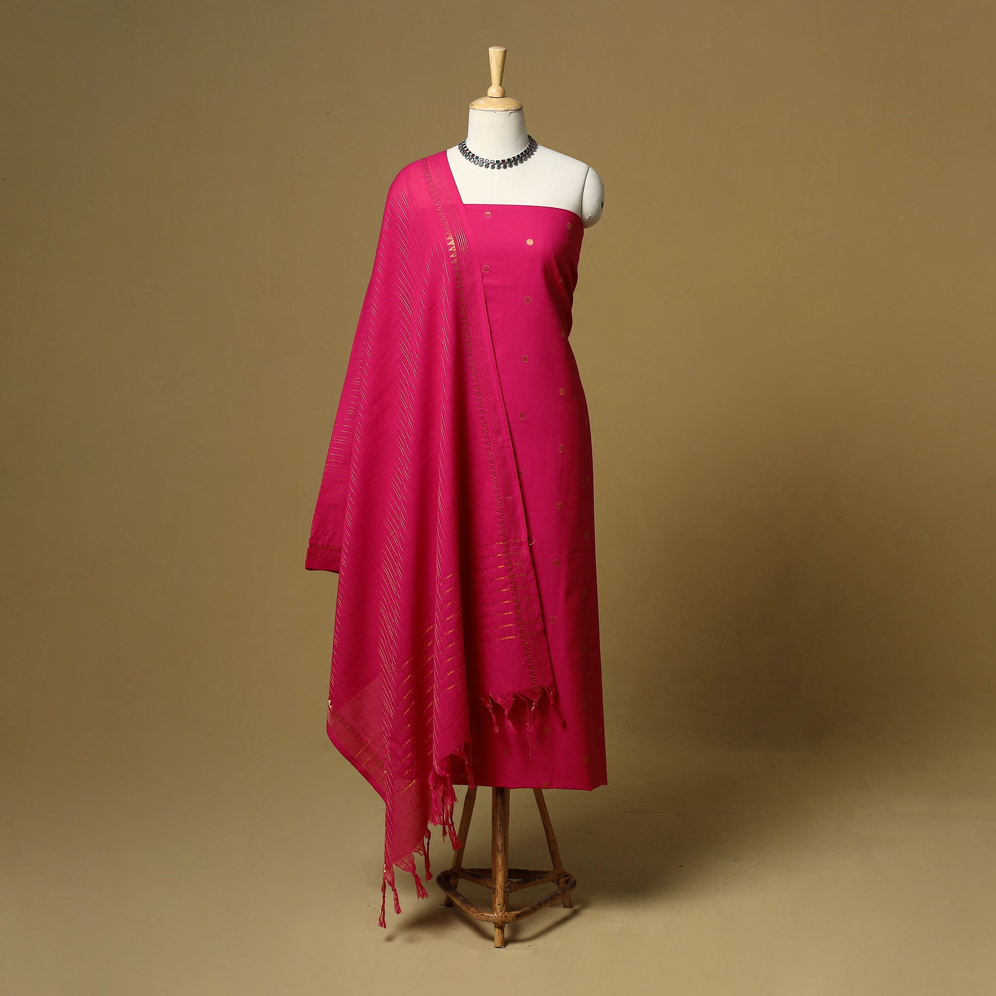 Pure cotton jacquard zari buti 3pc unstitched dress material set from Tamil Nadu, where patterns are created directly during the weaving process. This set includes a beautifully woven kurta fabric, plain bottom fabric and a matching bordered dupatta. Easy to stitch and comfortable to wear, this set works well for daily wear and casual outings.