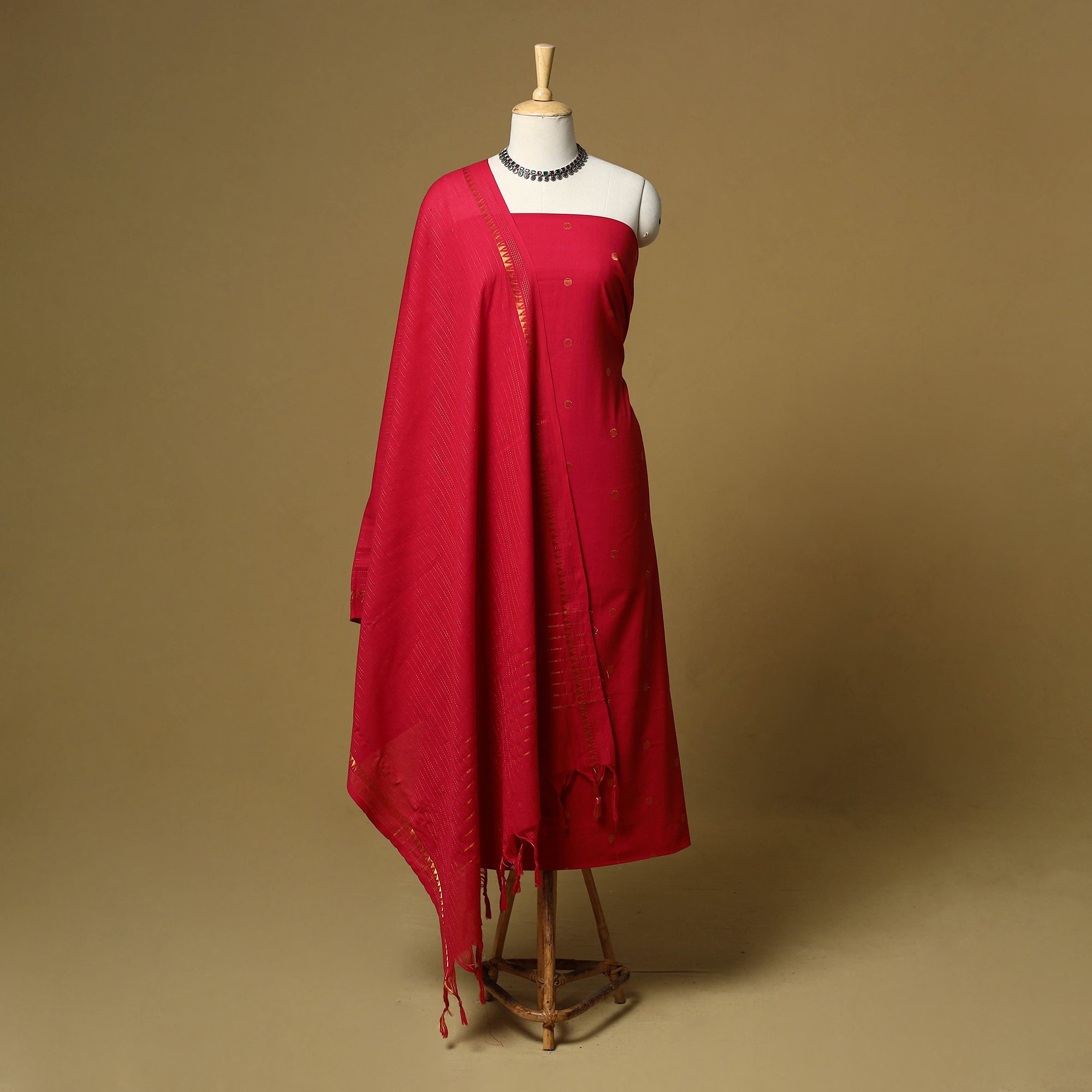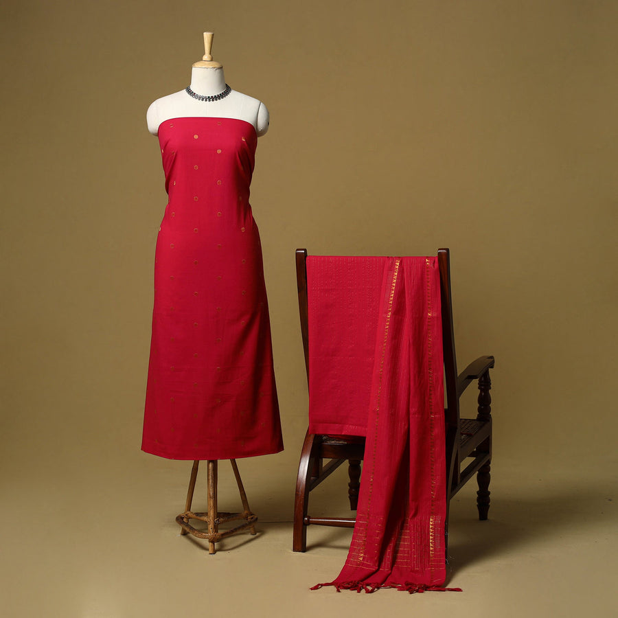 Pure cotton jacquard zari buti 3pc unstitched dress material set from Tamil Nadu, where patterns are created directly during the weaving process. This set includes a beautifully woven kurta fabric, plain bottom fabric and a matching bordered dupatta. Easy to stitch and comfortable to wear, this set works well for daily wear and casual outings.