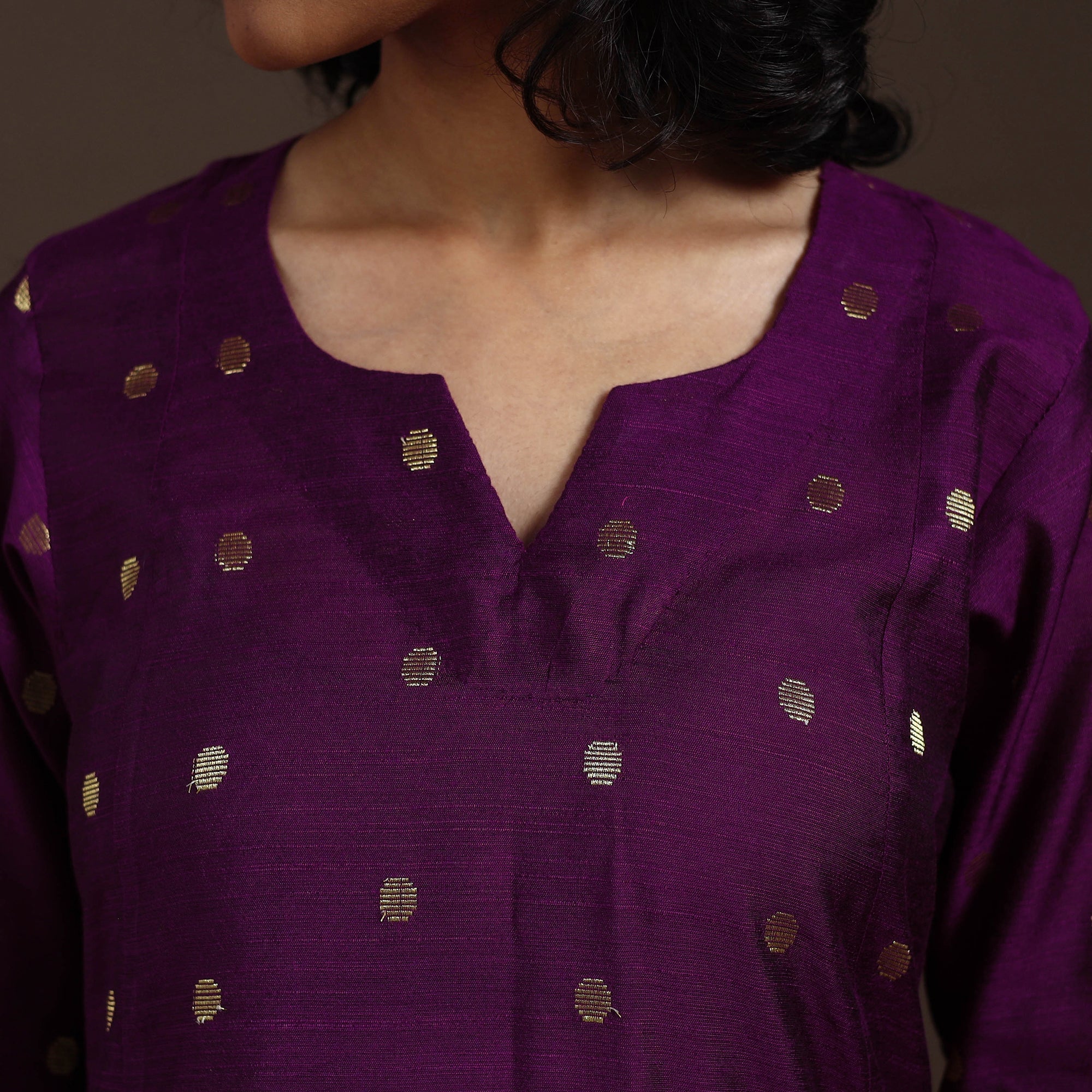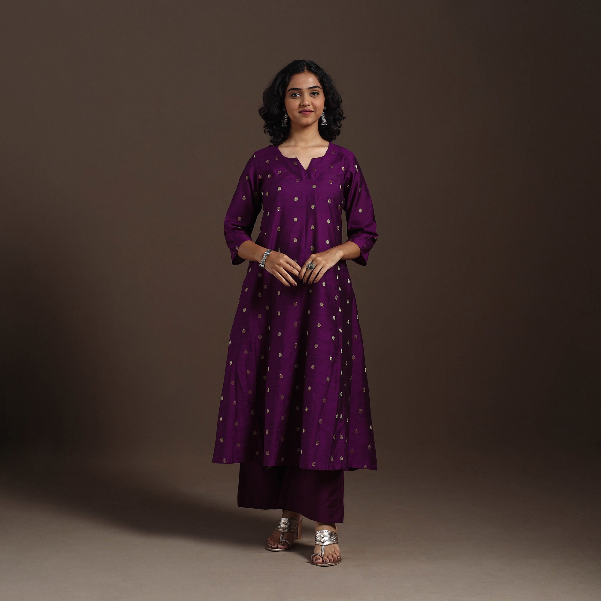 This uniquely designed purple zari buti A-line kurta set blends comfort with elegance. Made from a high-quality viscose-polyester blend that mimics dupion silk, the kurta features a functional side pocket. It pairs with a slub-textured plain palazzo, thoughtfully designed with two side pockets. Soft, breathable, and chic, this set is perfect for both everyday wear and festive occasions.