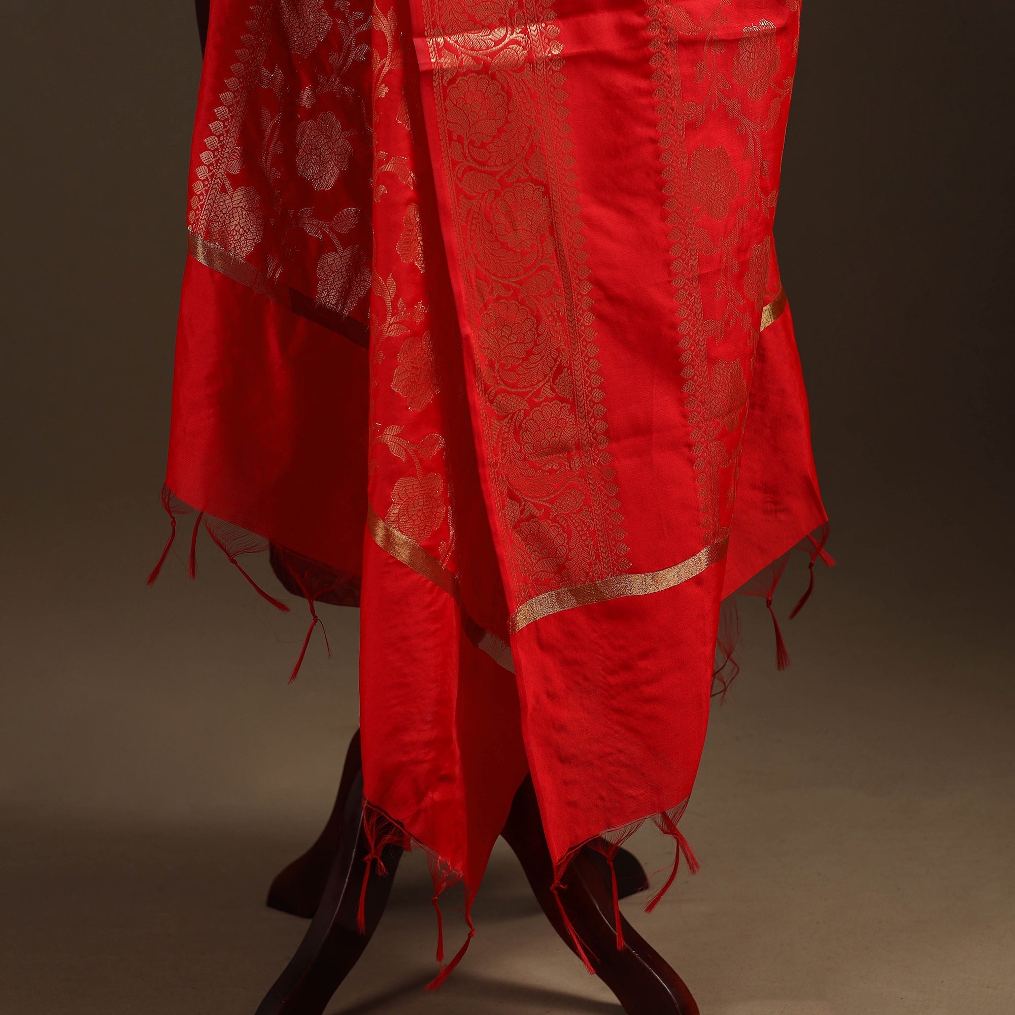 Red banarasi dupatta with tassels and features intricate zari detailing inspired by the weaving traditions of Banaras. Made from art silk, it is lightweight, comfortable and easy to drape. A versatile accessory that pairs well with traditional outfits.