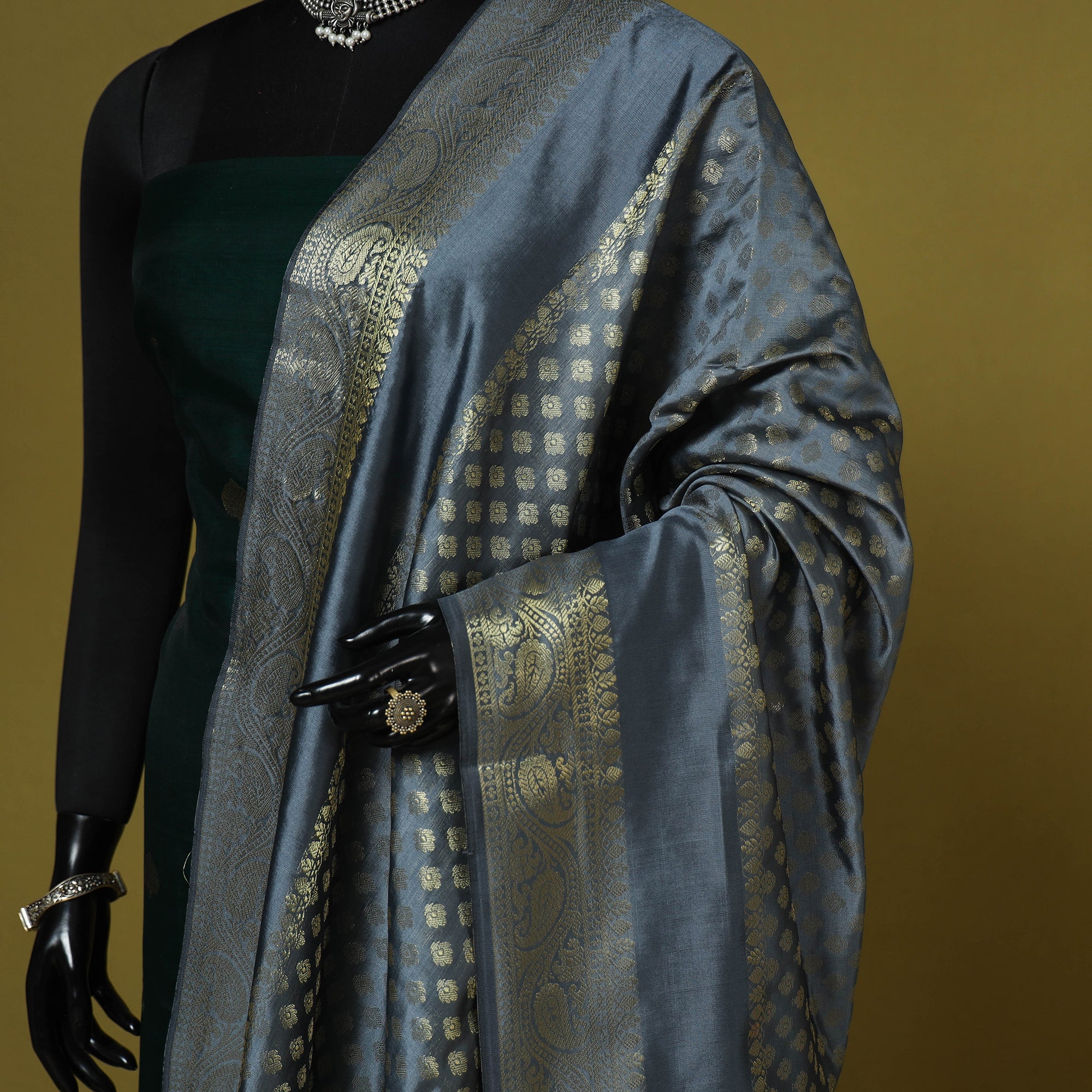 This grey banarasi art silk dupatta with zari work and tassels is a graceful addition to your wardrobe. The intricate zari detailing enhances its elegance, while the tassels lend a stylish finish. Crafted from art silk, it is lightweight, comfortable, and easy to drape. Perfect for pairing with traditional ensembles, this dupatta combines timeless charm with modern appeal, making it a must-have accessory.