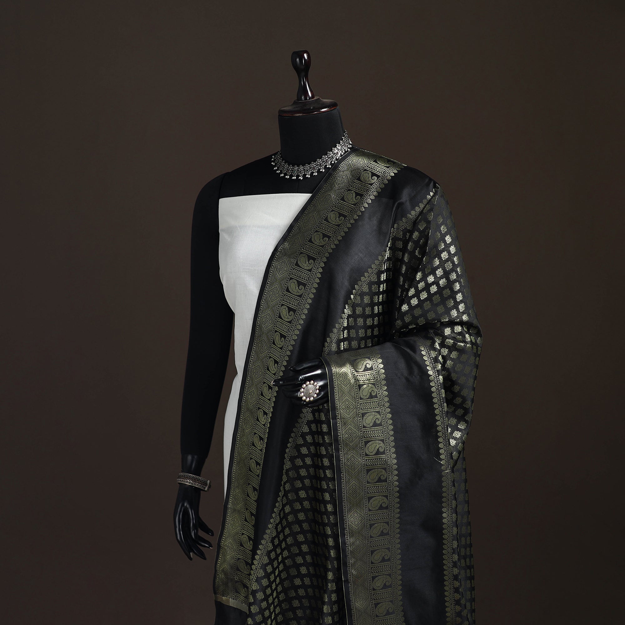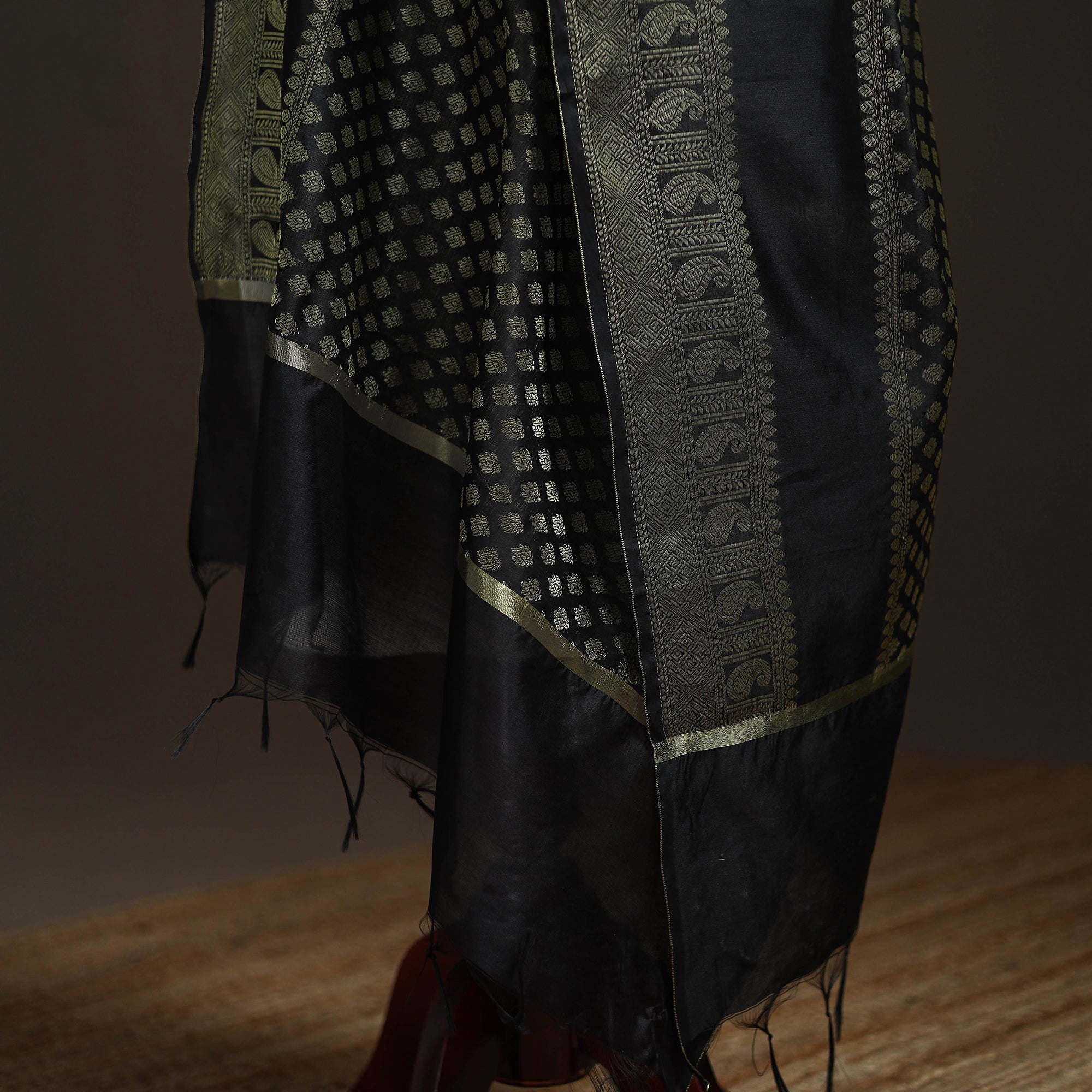 Black banarasi dupatta is crafted in varanasi and features beautiful zari work with tassels at the ends. The zari design adds a graceful look, while the tassels give it a neat finish. Made from art silk, it is lightweight, comfortable and easy to drape. You can pair this dupatta with kurta sets, salwar suits and festive outfits. It is suitable for daily wear, puja, small functions and occasions.